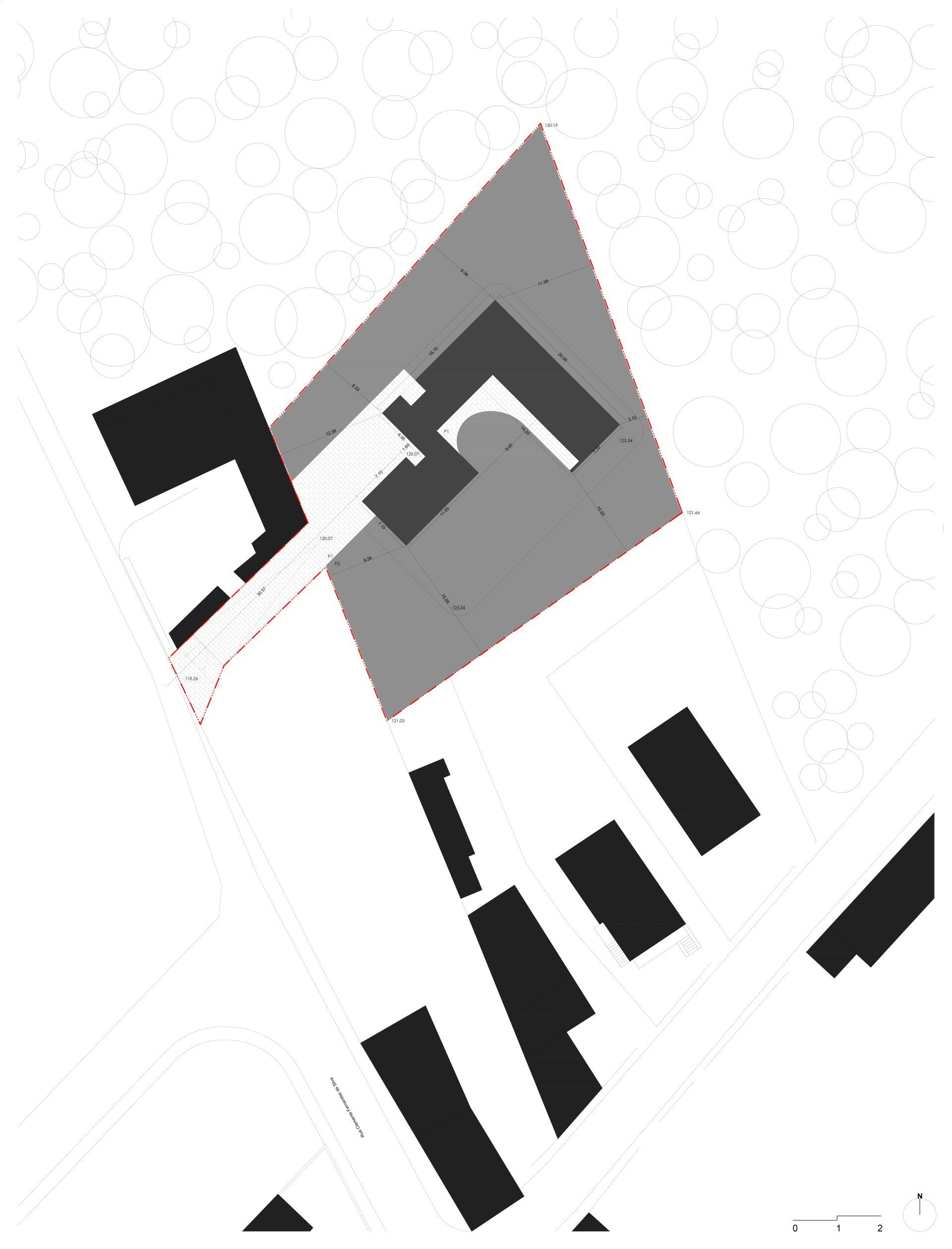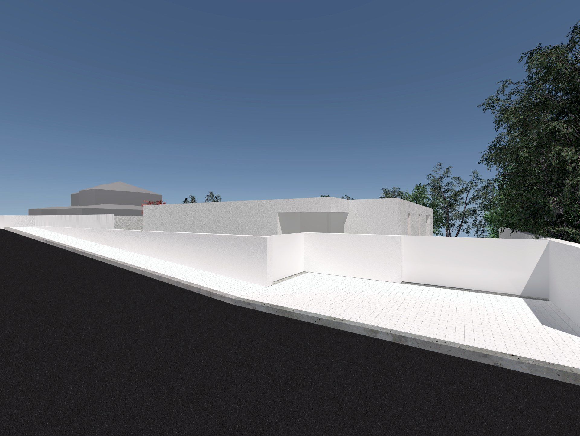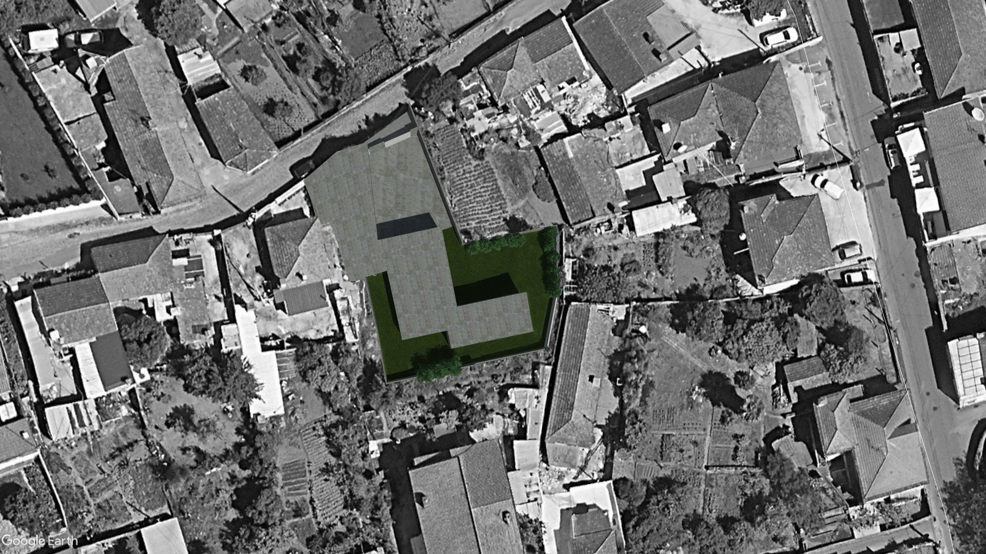 O terreno, afastado da frente urbana tem uma geometria singular próxima de um losango com um “braço” que se prolonga até á rua, assume um carácter de “interior de quarteirão”.