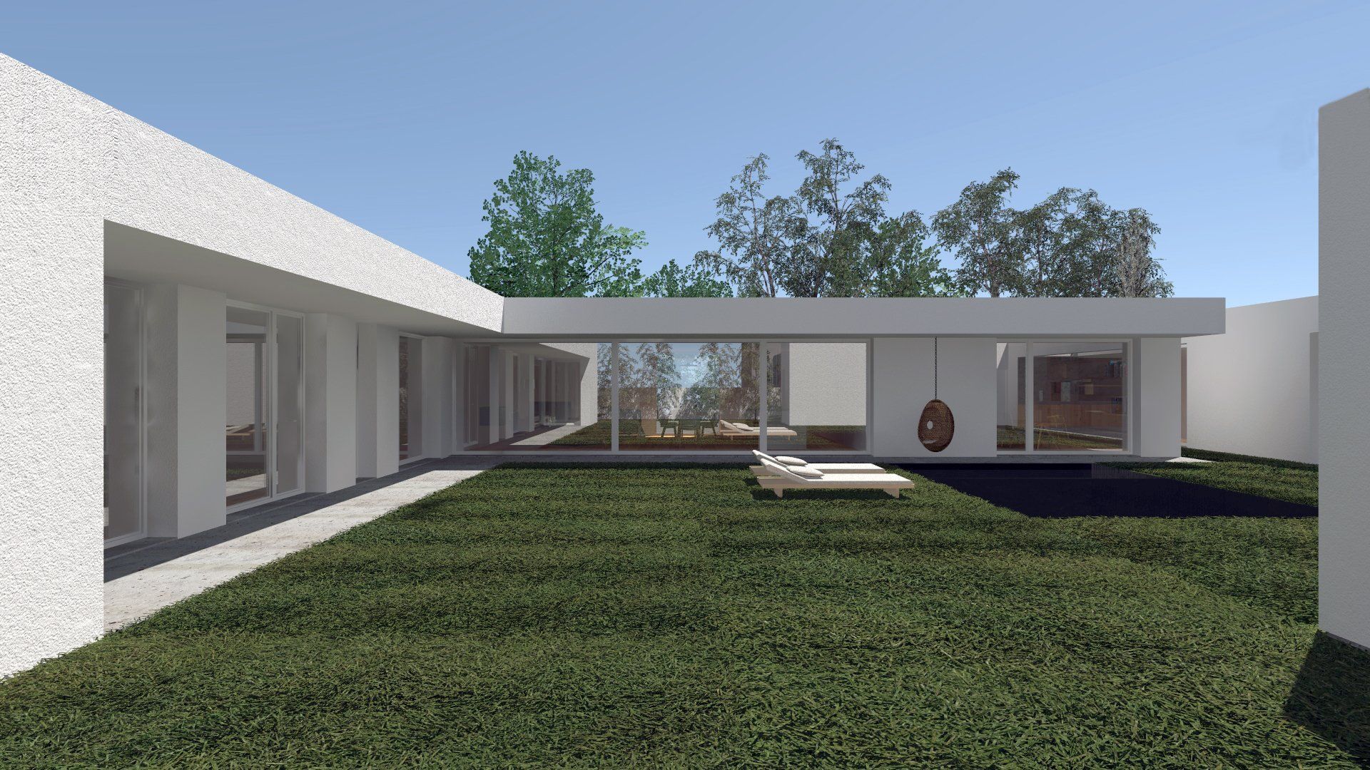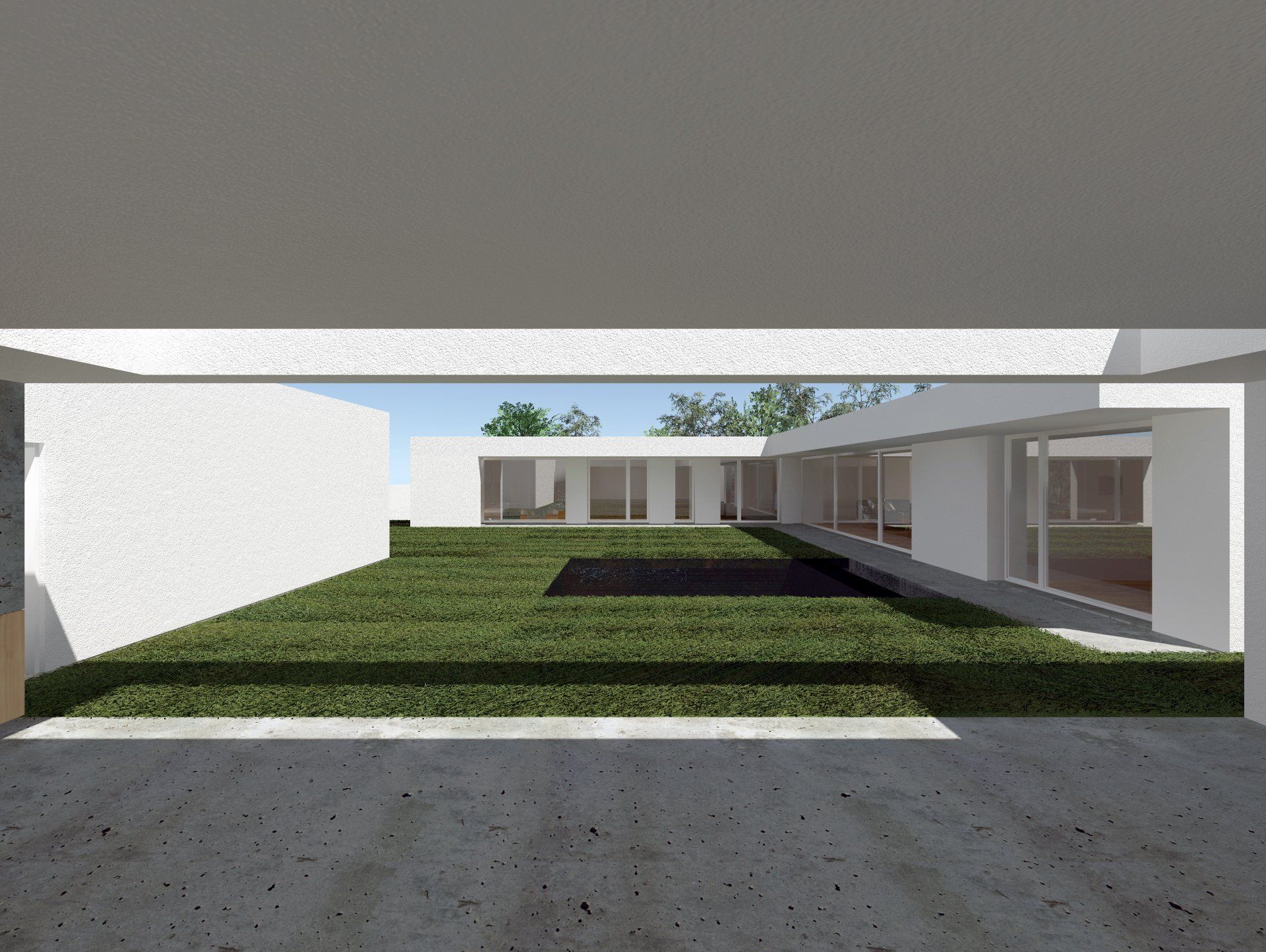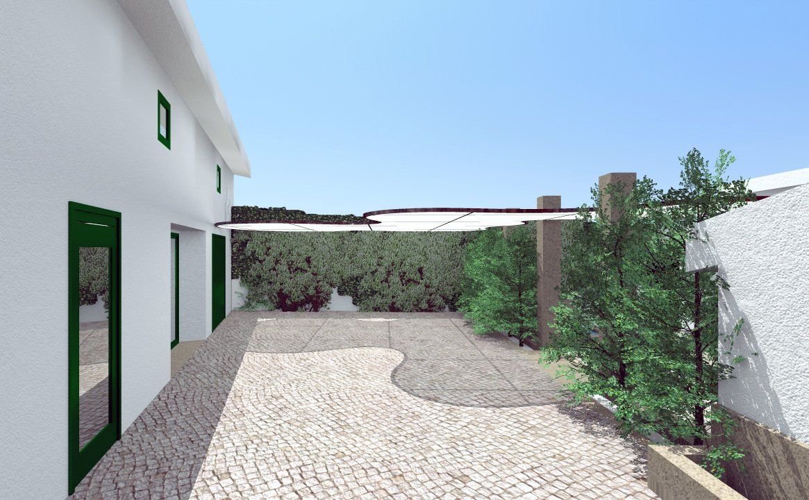 Começa por se uniformizar o material do piso dos pátios e muda-se o local da escada. A separação dos pátios é vincada por um conjunto de colunas de granito, remetendo para memória de um “claustro” inacabado, integrando-se no ambiente e conferindo mais nobreza ao pátio da Casa Grande. A cobertura, assume um desenho orgânico que recria a silhueta das copas das árvores, moldando-se às circunstâncias do programa e do sítio, definindo dois espaços de lazer entre as duas casas. Construída com uma estrutura em aço-corten e coberta com policarbonato branco translucido, a cobertura parece suspensa, apoiada apenas nos pontos de contacto com as construções existentes e nas colunas de granito.