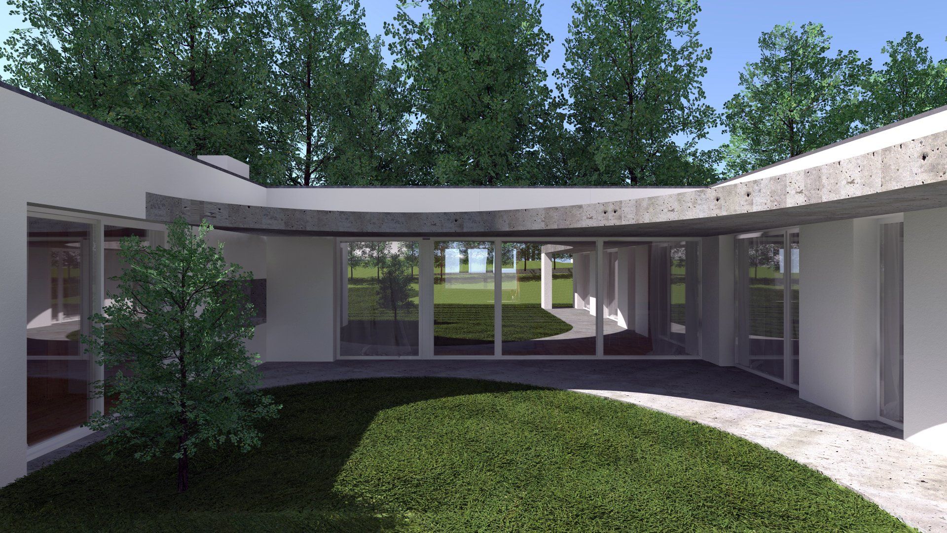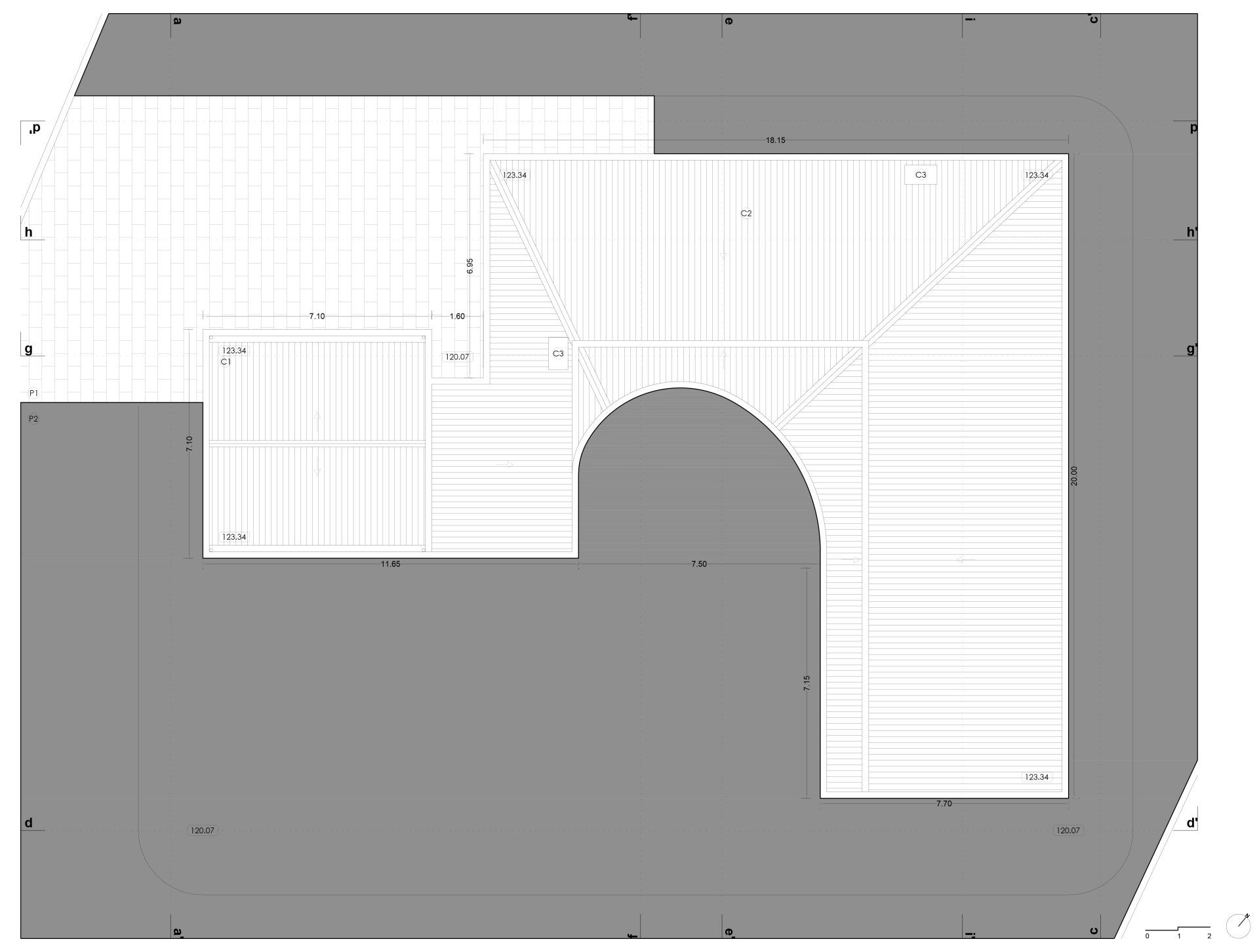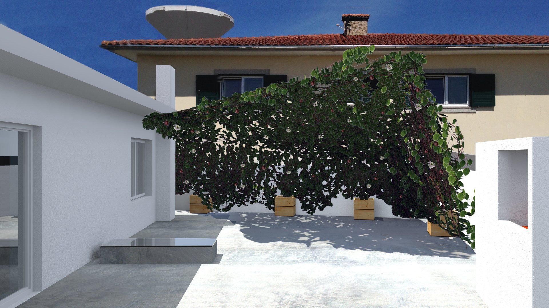 Começa por se uniformizar o material do piso dos pátios e muda-se o local da escada. A separação dos pátios é vincada por um conjunto de colunas de granito, remetendo para memória de um “claustro” inacabado, integrando-se no ambiente e conferindo mais nobreza ao pátio da Casa Grande. A cobertura, assume um desenho orgânico que recria a silhueta das copas das árvores, moldando-se às circunstâncias do programa e do sítio, definindo dois espaços de lazer entre as duas casas. Construída com uma estrutura em aço-corten e coberta com policarbonato branco translucido, a cobertura parece suspensa, apoiada apenas nos pontos de contacto com as construções existentes e nas colunas de granito.