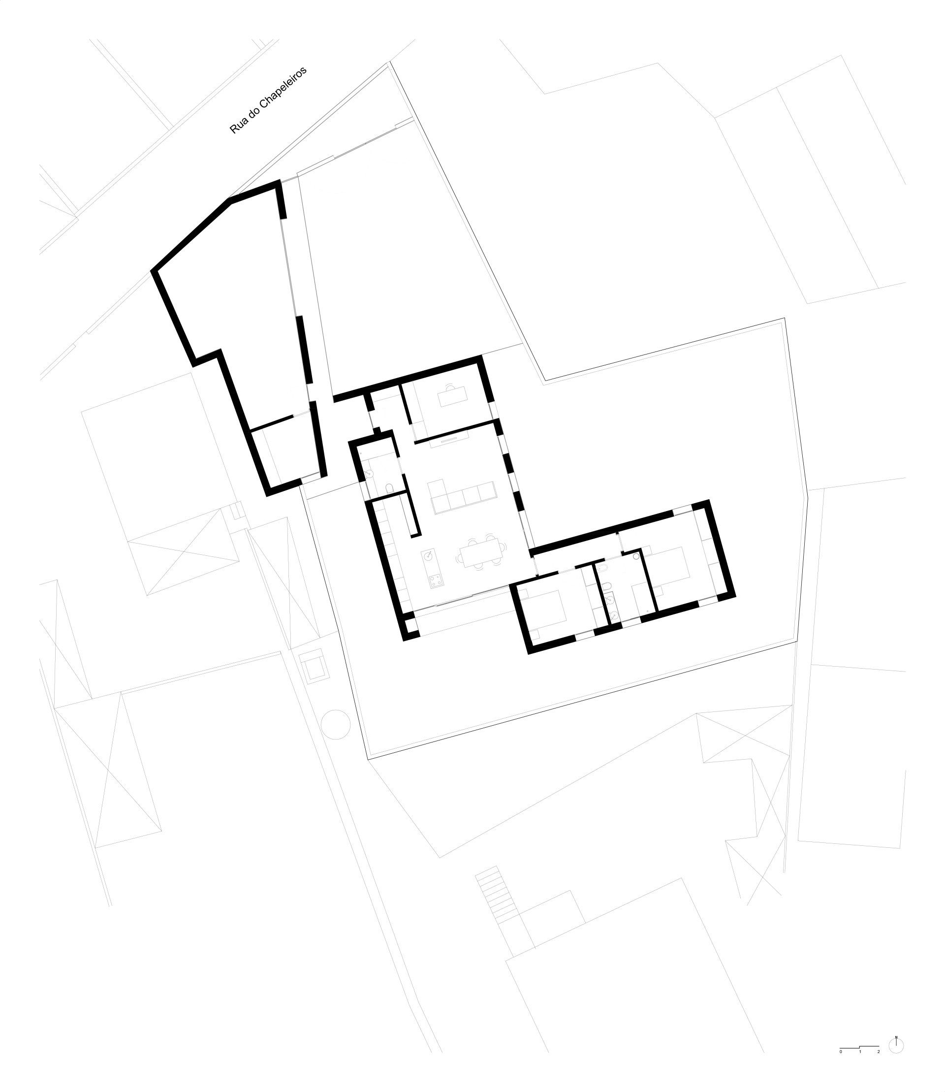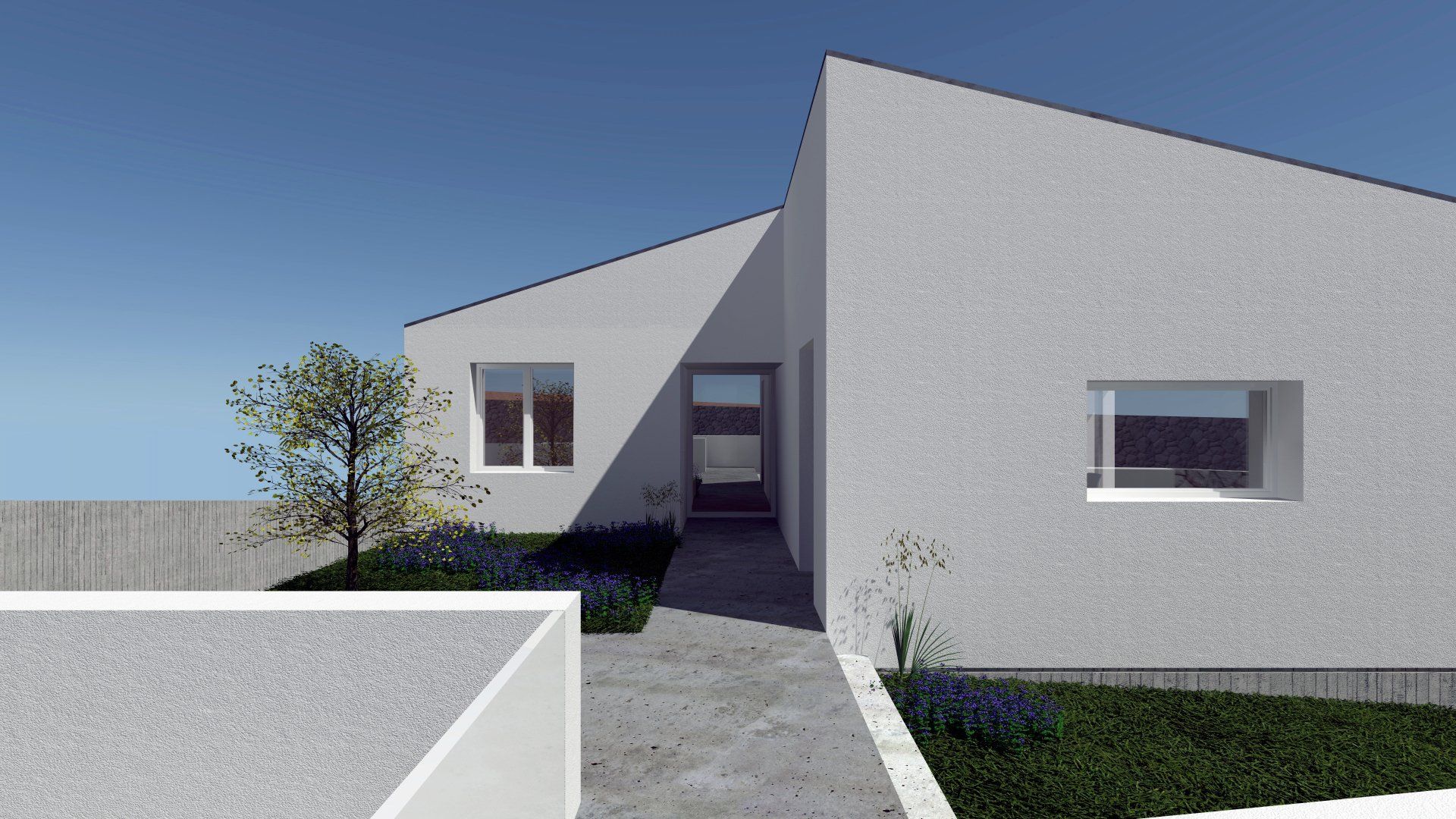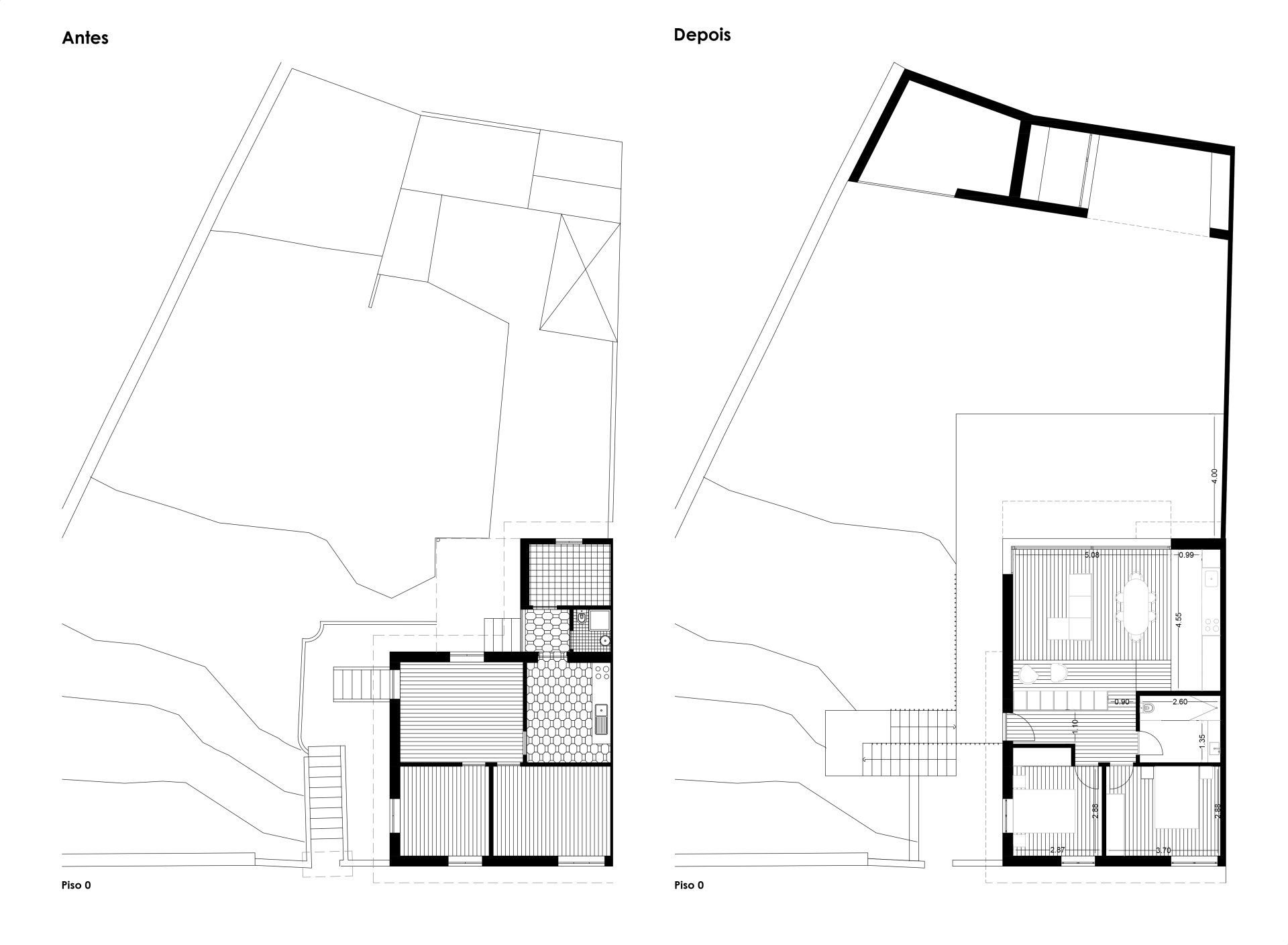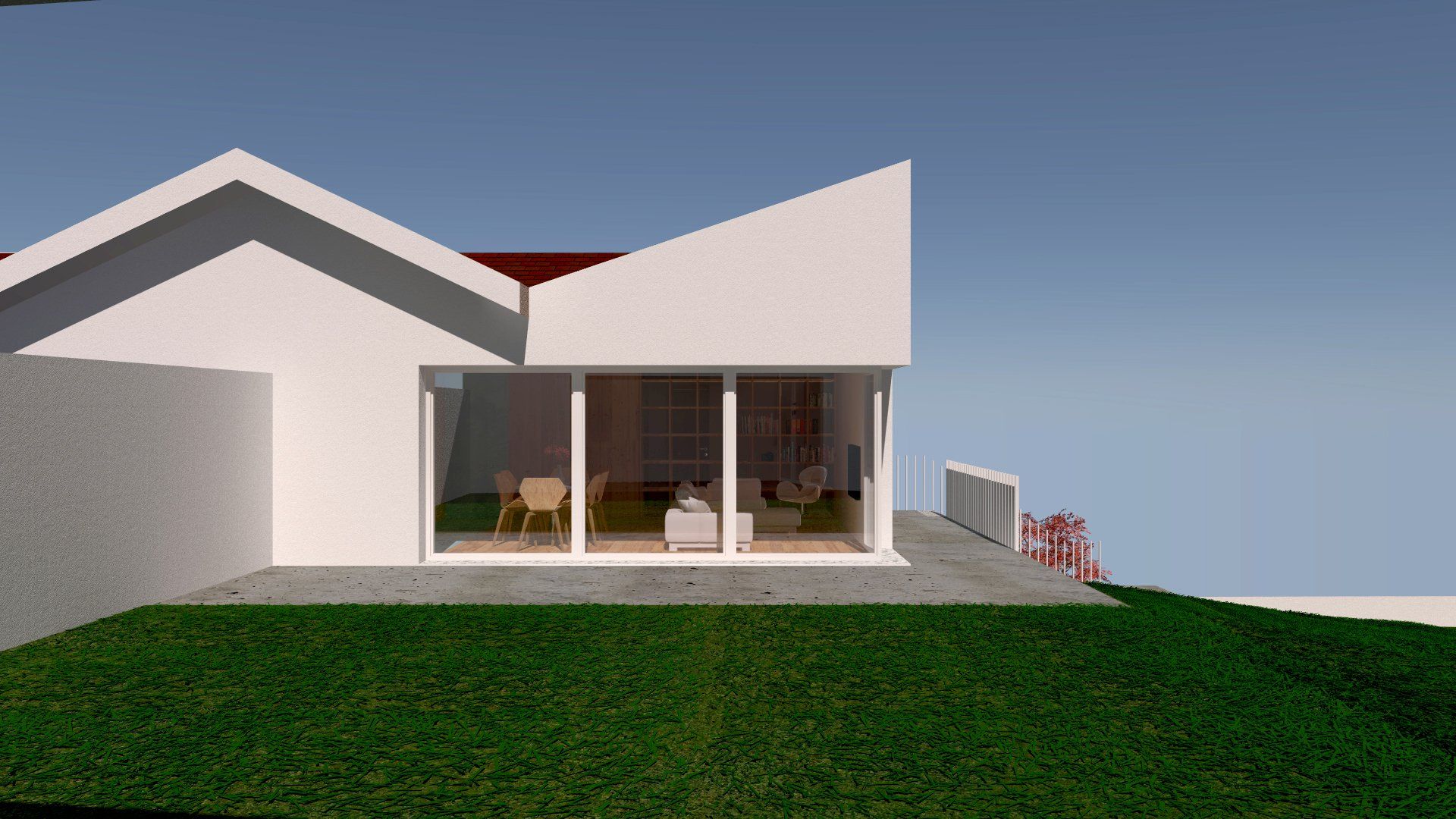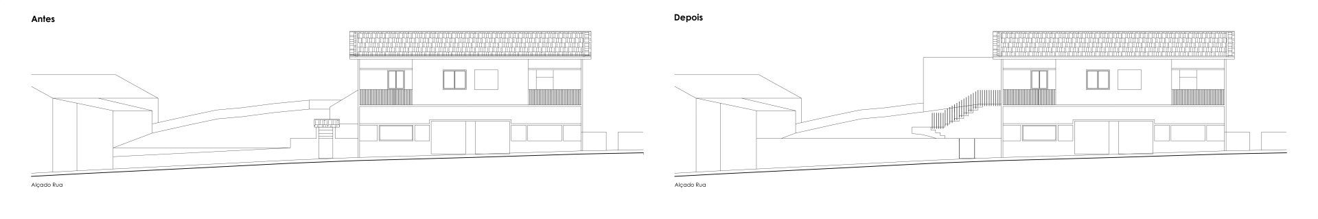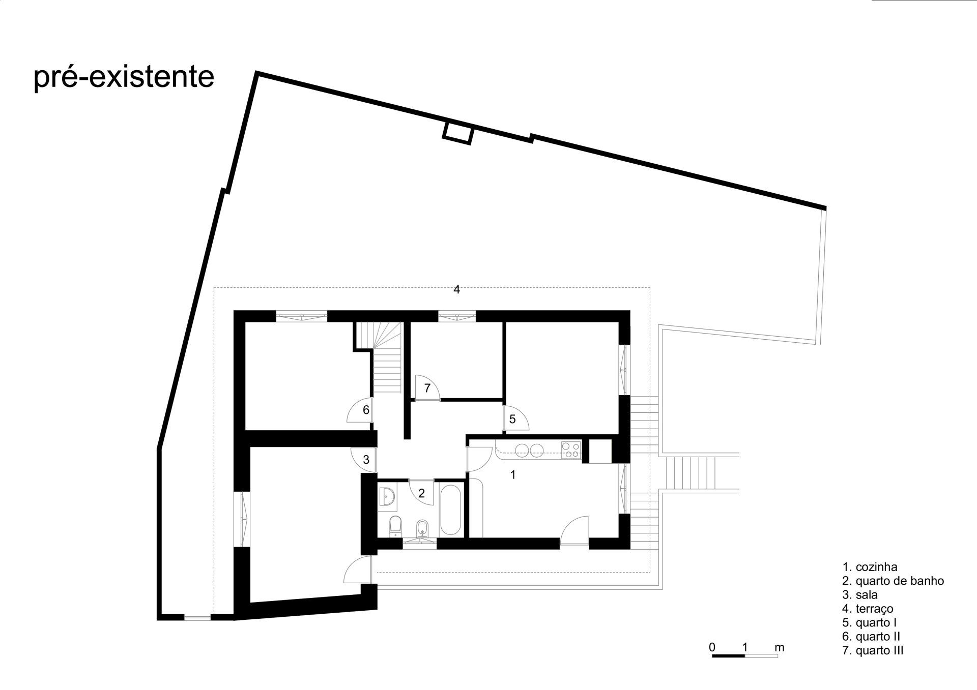 A casa pré-existente é construção tradicional, geminada com a planta em L. Com o objetivo de aumentar área, é acrescentado um volume que lhe completa polígono retangular. A sua imagem formal continua a silhueta da casa preexistente, mantendo a imagens tradicional de casa embora de forma contemporânea.