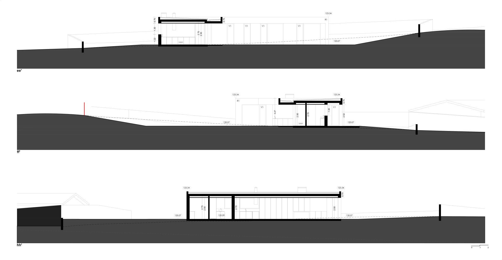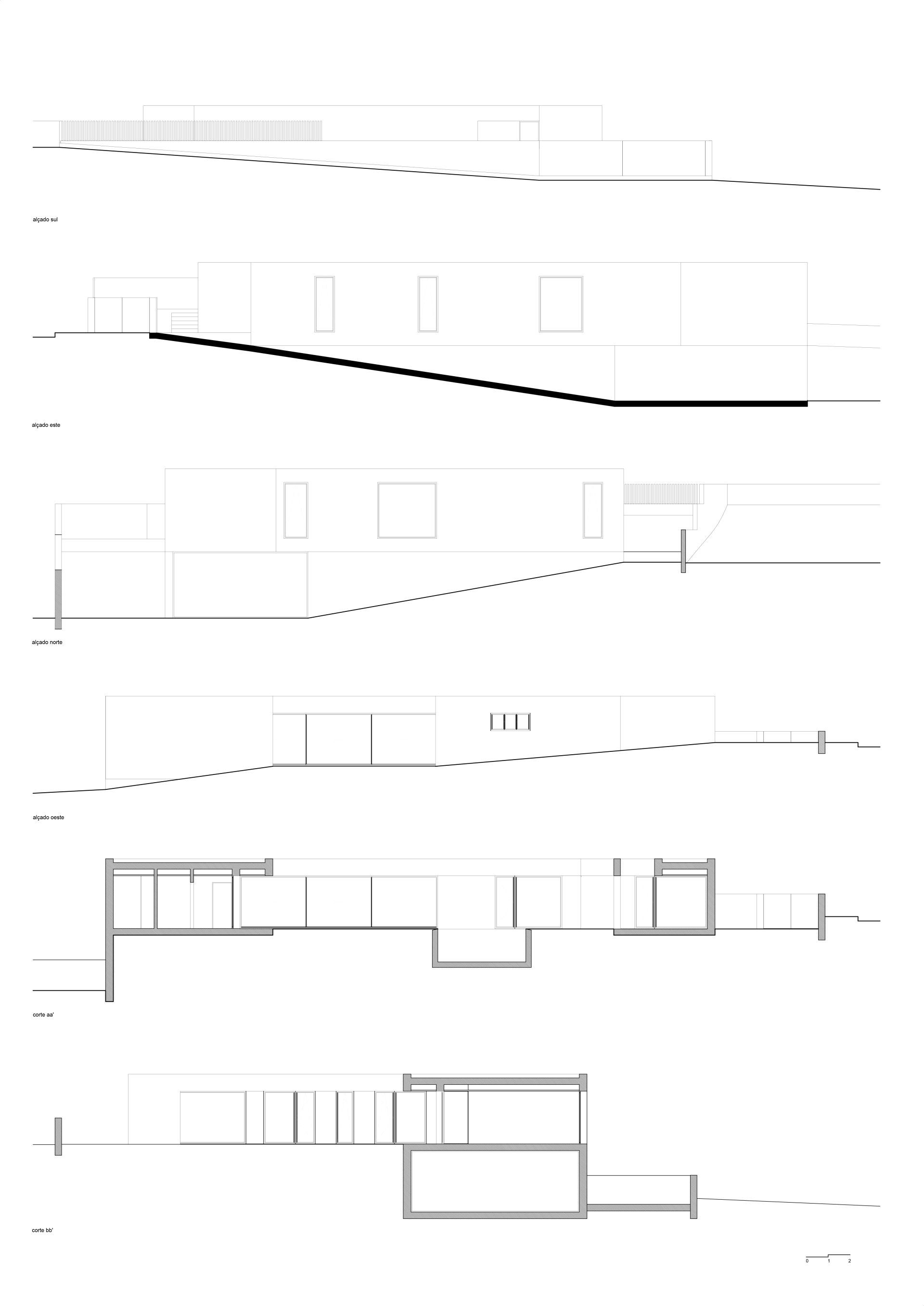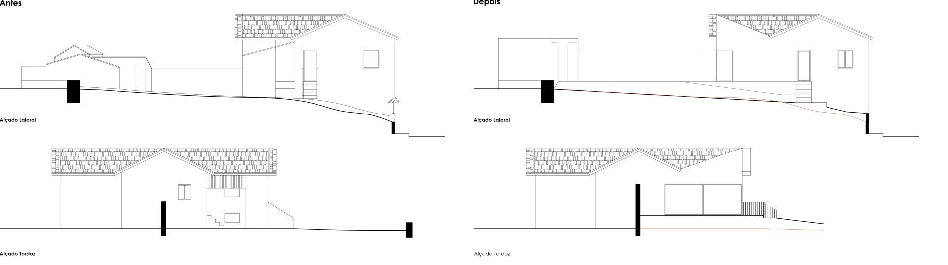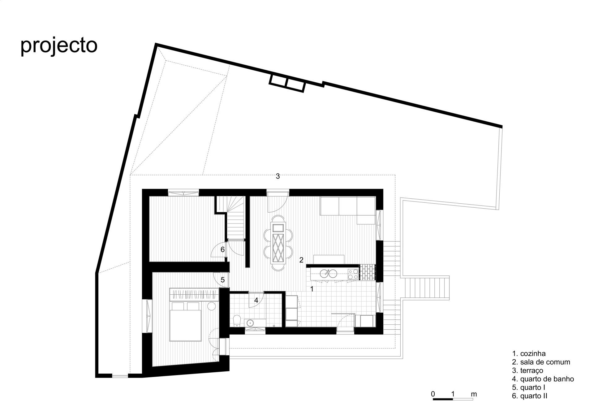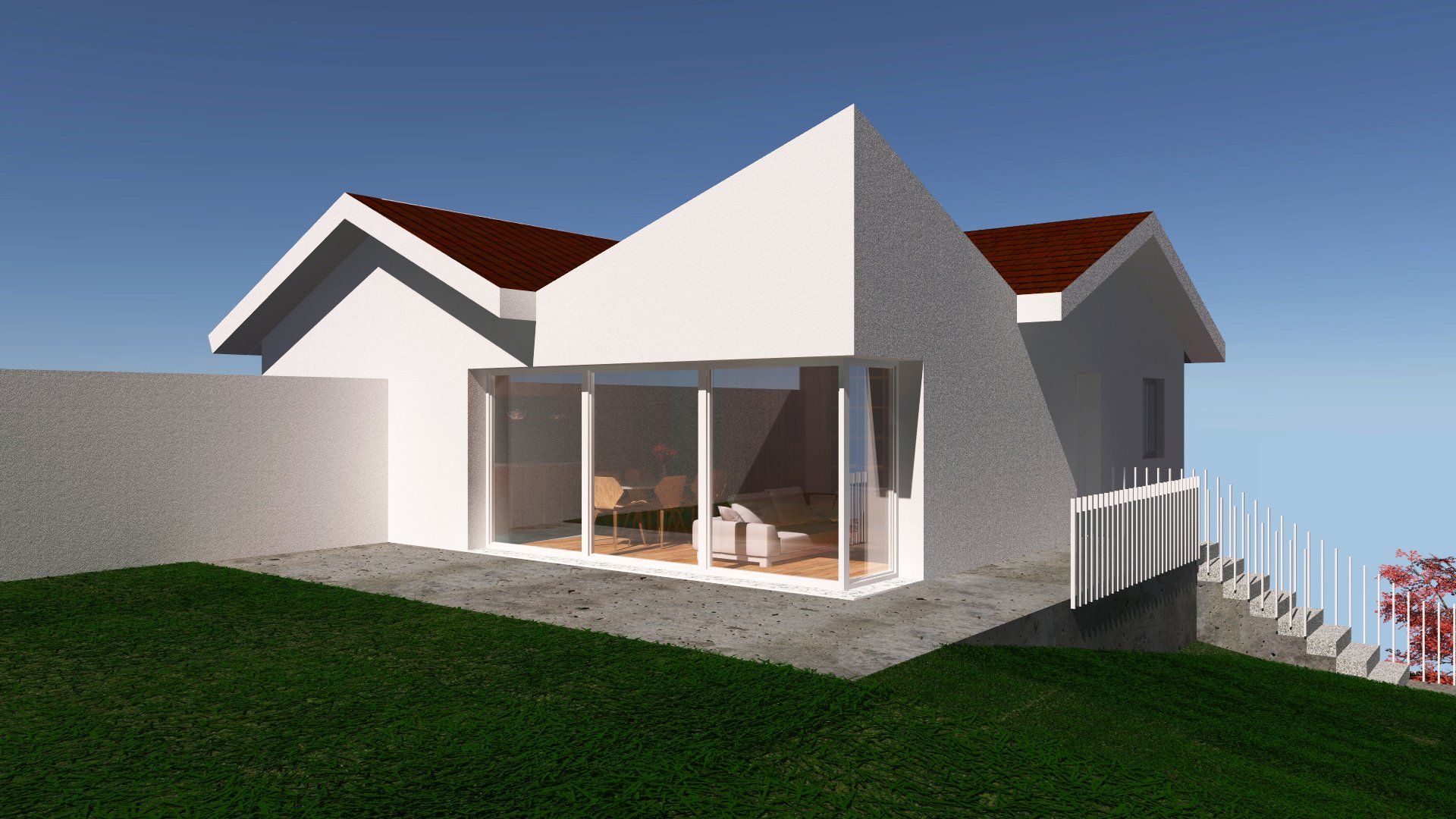 A casa pré-existente é construção tradicional, geminada com a planta em L. Com o objetivo de aumentar área, é acrescentado um volume que lhe completa polígono retangular. A sua imagem formal continua a silhueta da casa preexistente, mantendo a imagens tradicional de casa embora de forma contemporânea.