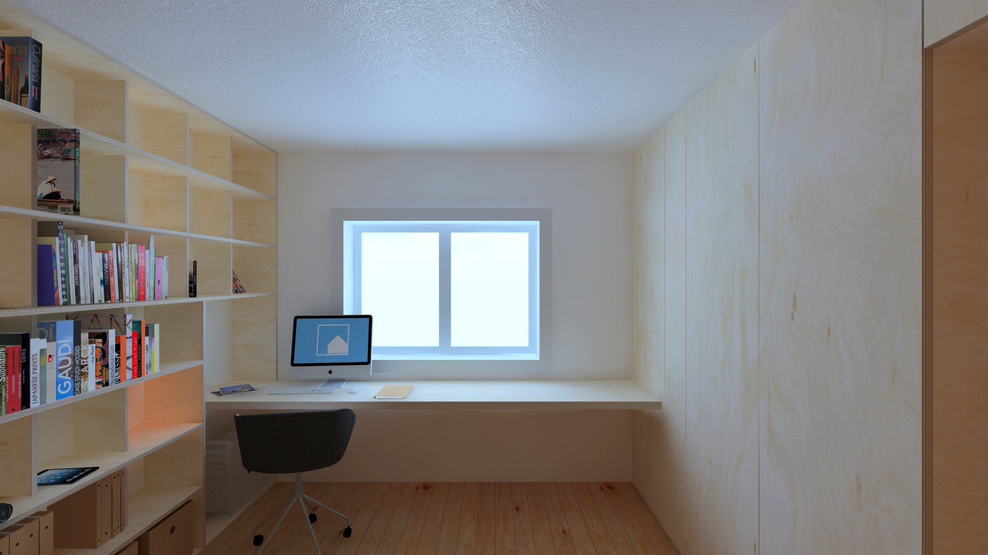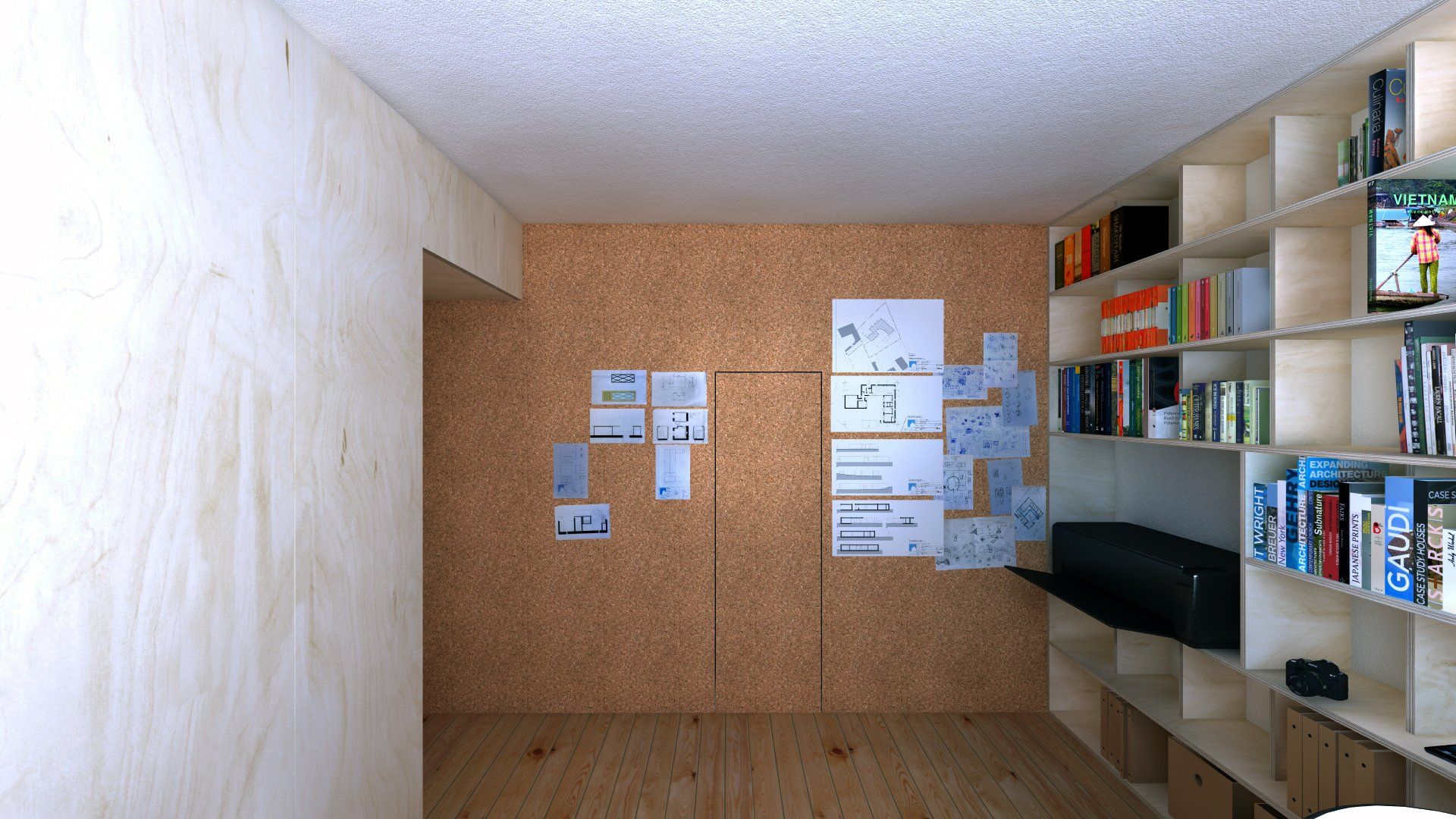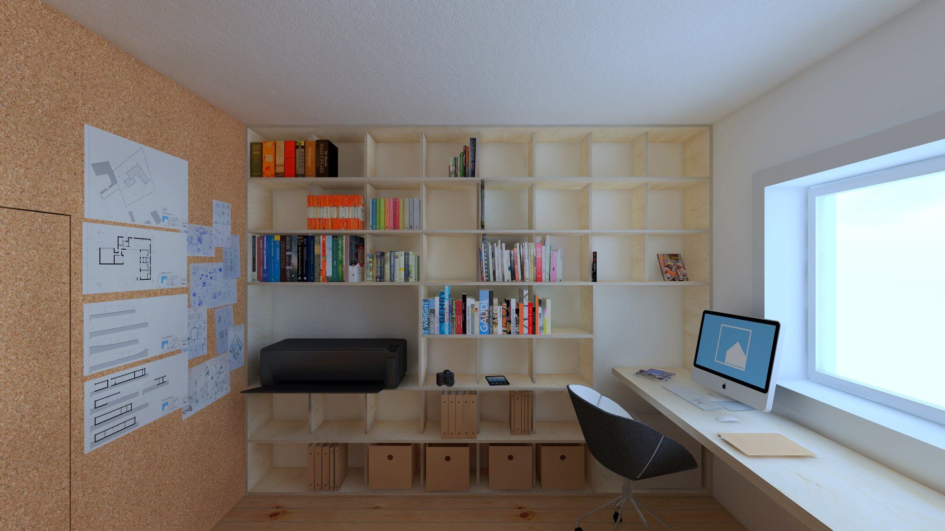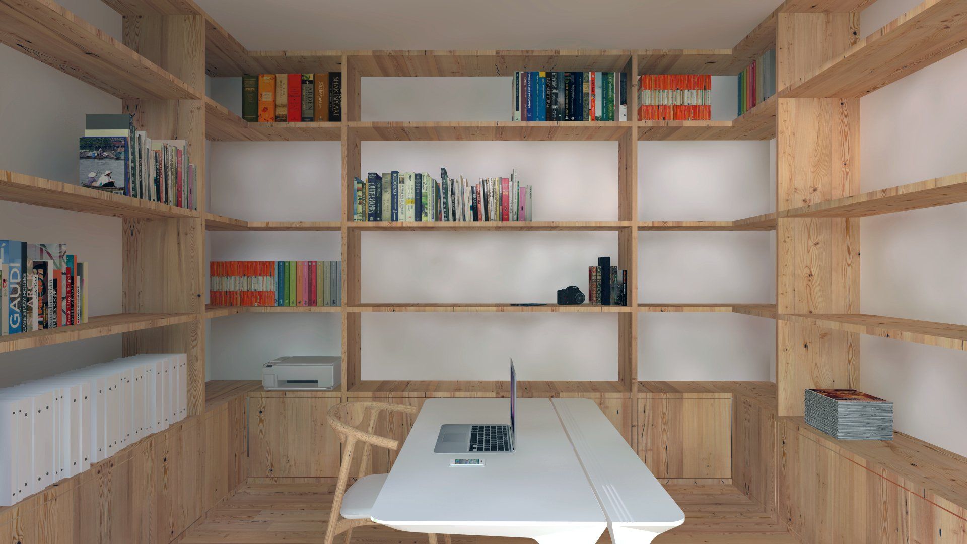 São desenhados os moveis necessários para o escritório - uma estante/biblioteca, uma mesa de trabalho com armazenamento – sem esquecer também um móvel que permita que o armazém continue, mas agora de forma organizada.