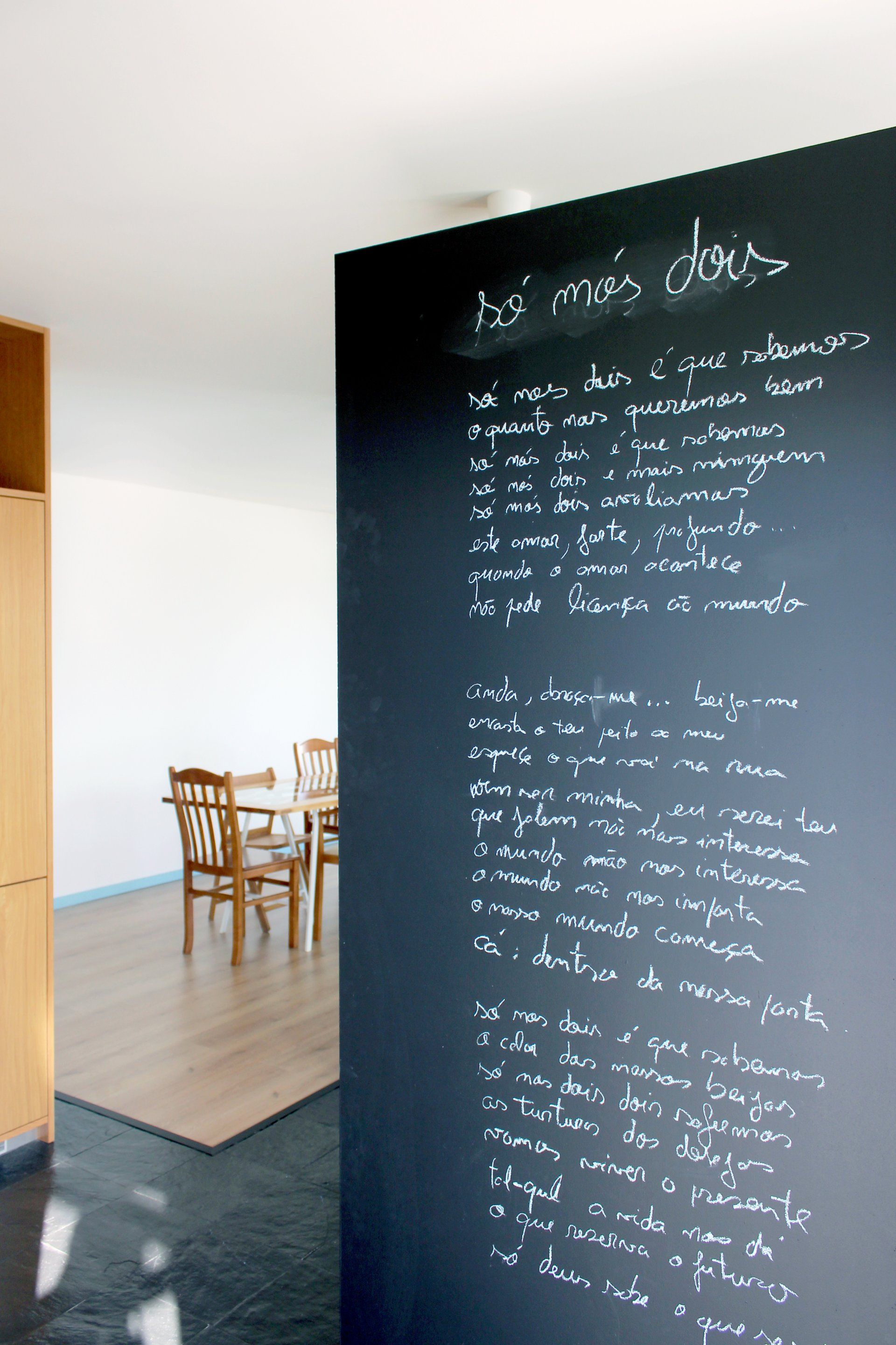 Ainda na cozinha, tem um grande quadro de giz - para escrever lista de compras, receitas, recados, etc. – ao mesmo tempo confere privacidade á entrada da casa.