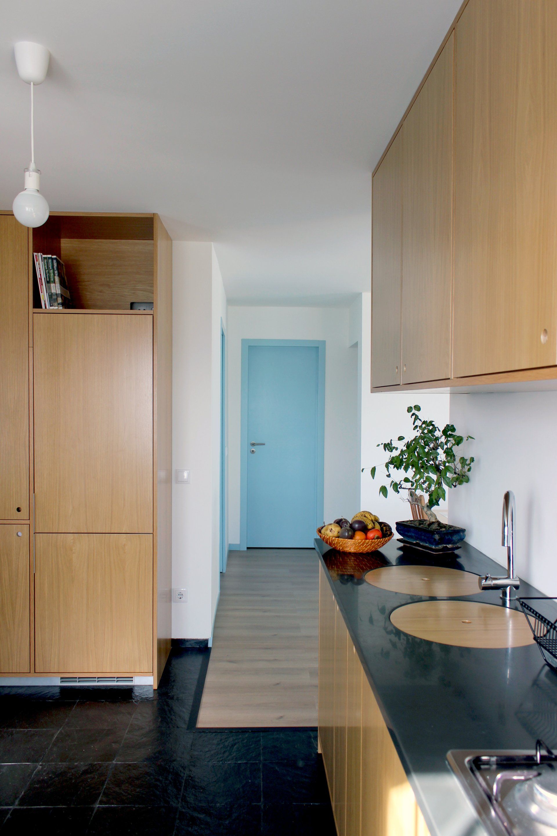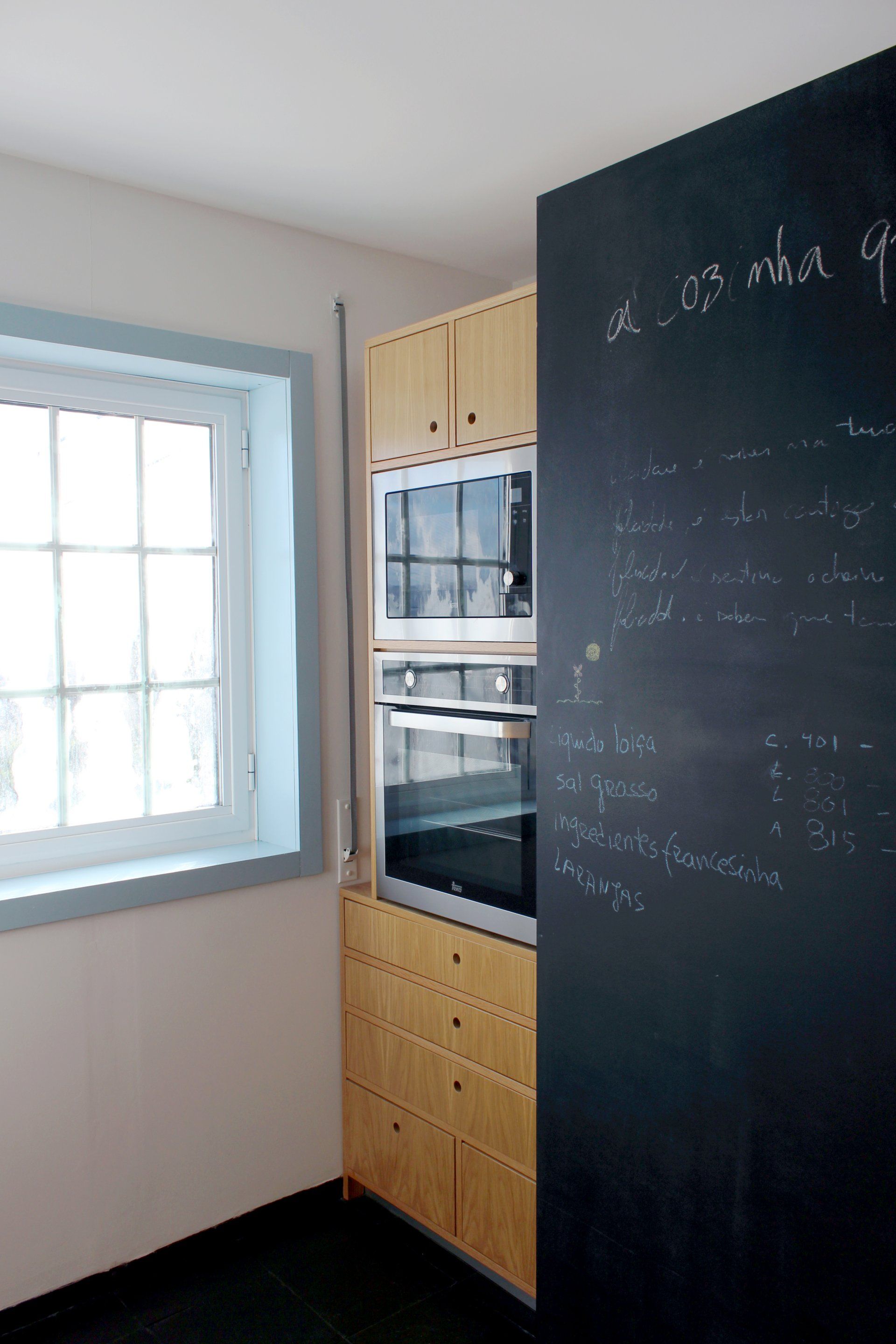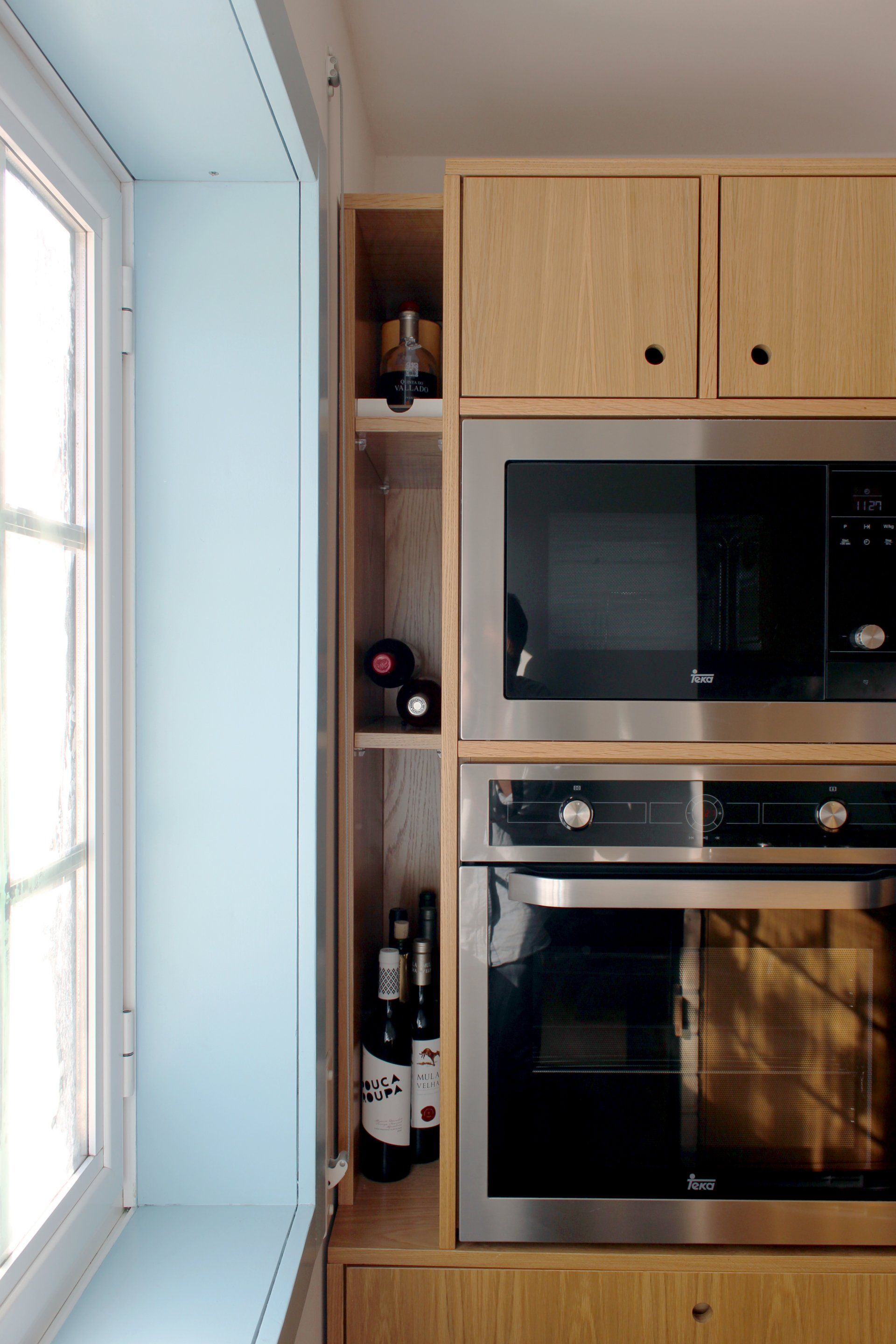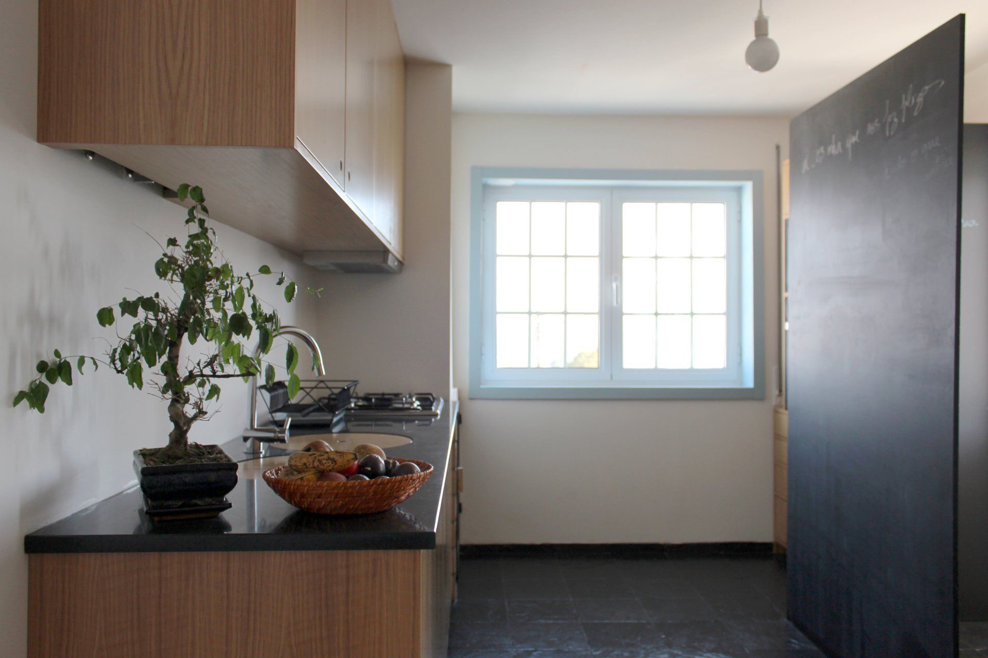 O carvalho, a ardosia e as particularidades do espaço foram os ingredientes desta cozinha. Da combinação destes ingredientes procurou-se com simplicidade o ponto certo de cozedura, e sem grandes temperos criaram-se uns móveis em carvalho com um balcão em ardosia e umas tampas para as pias, aumentando assim o espaço de balcão.