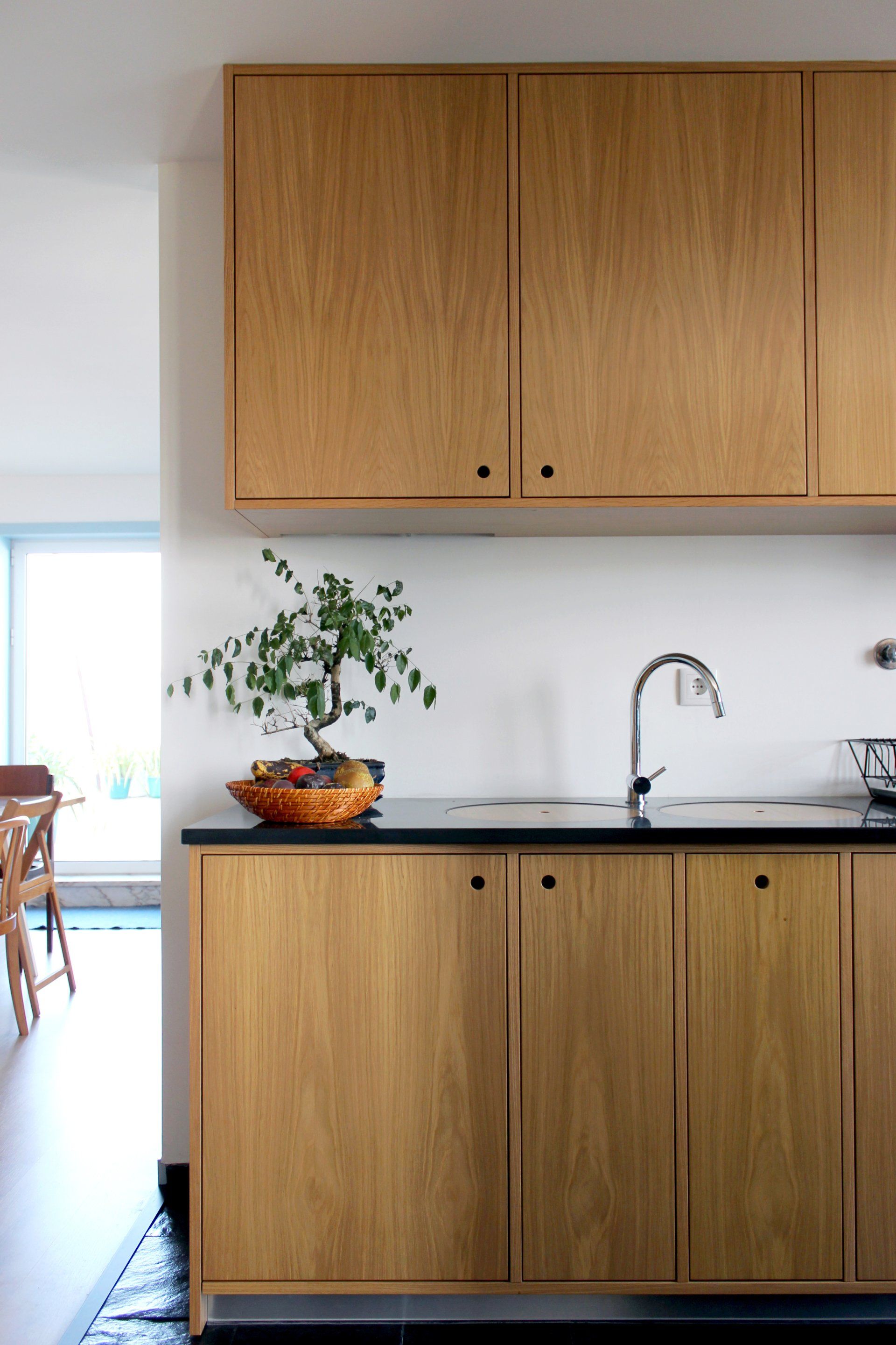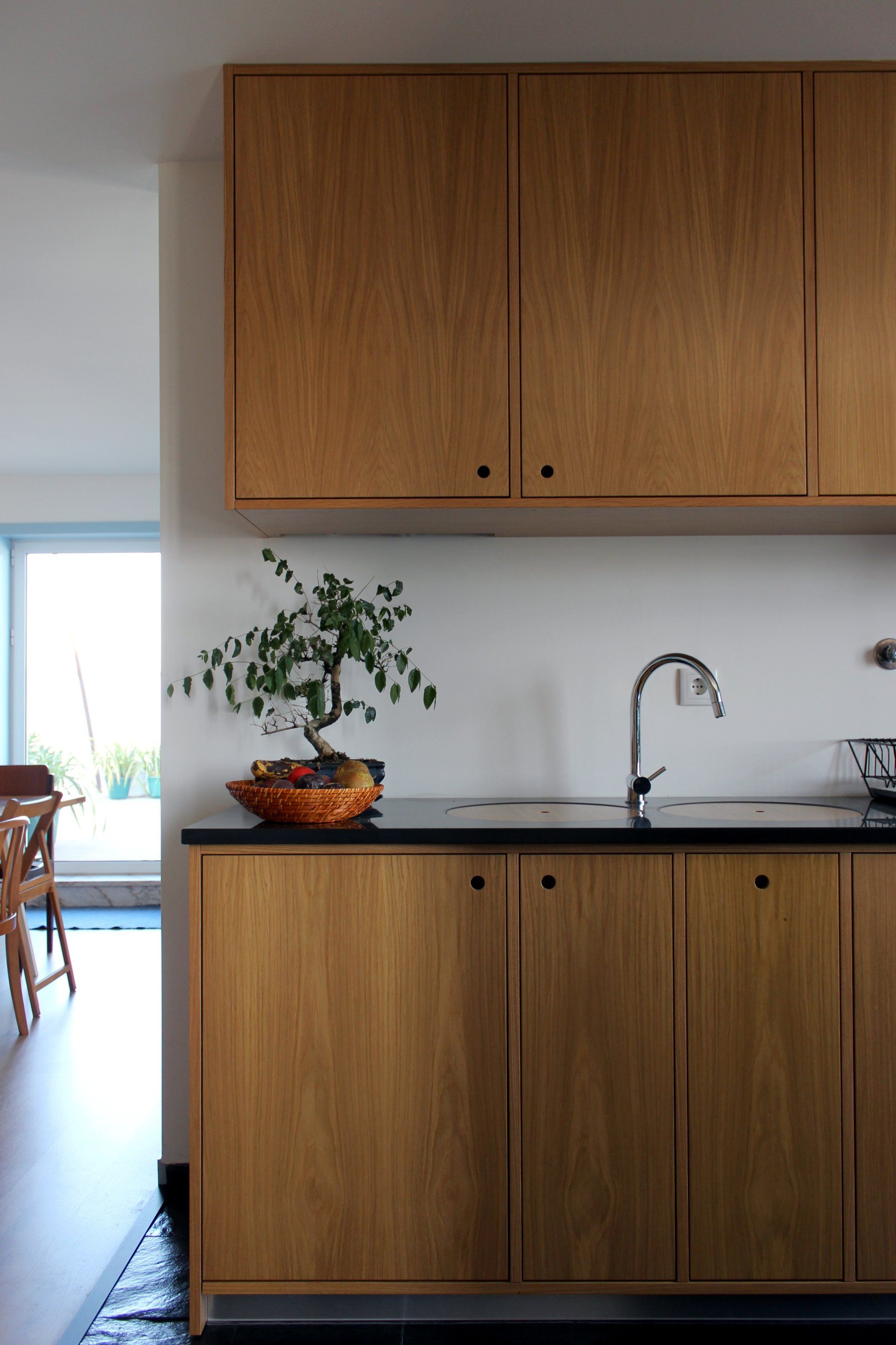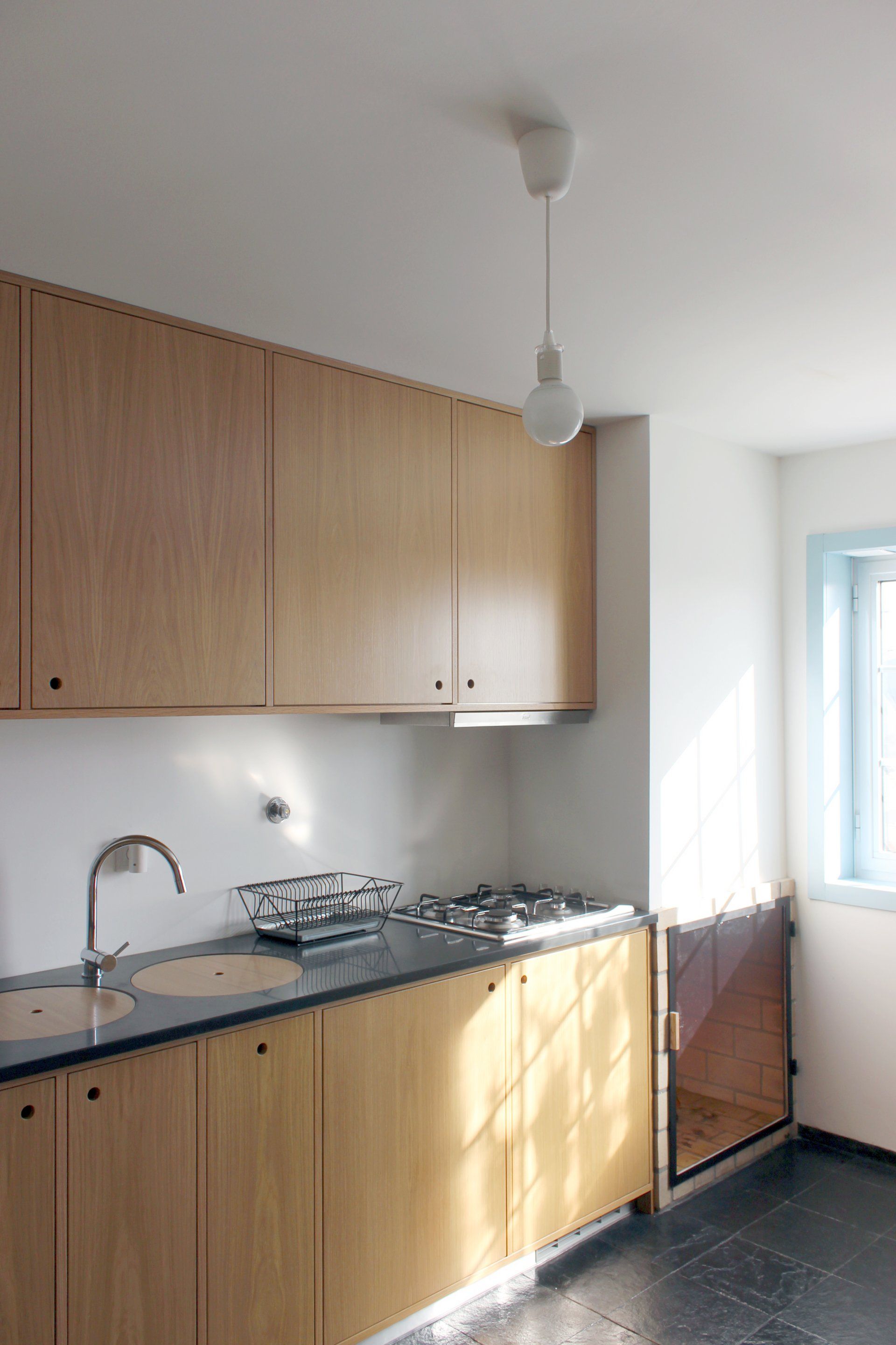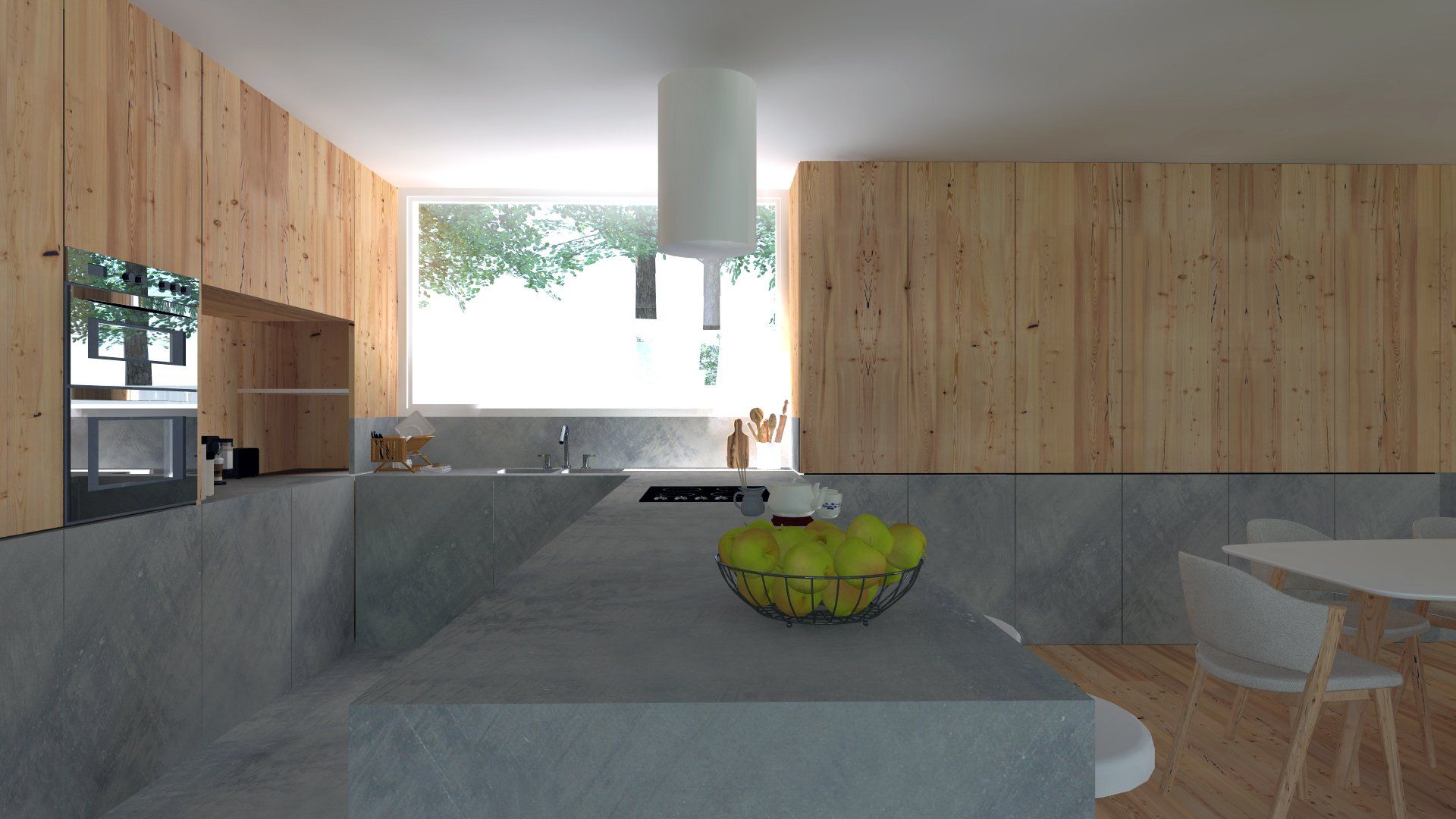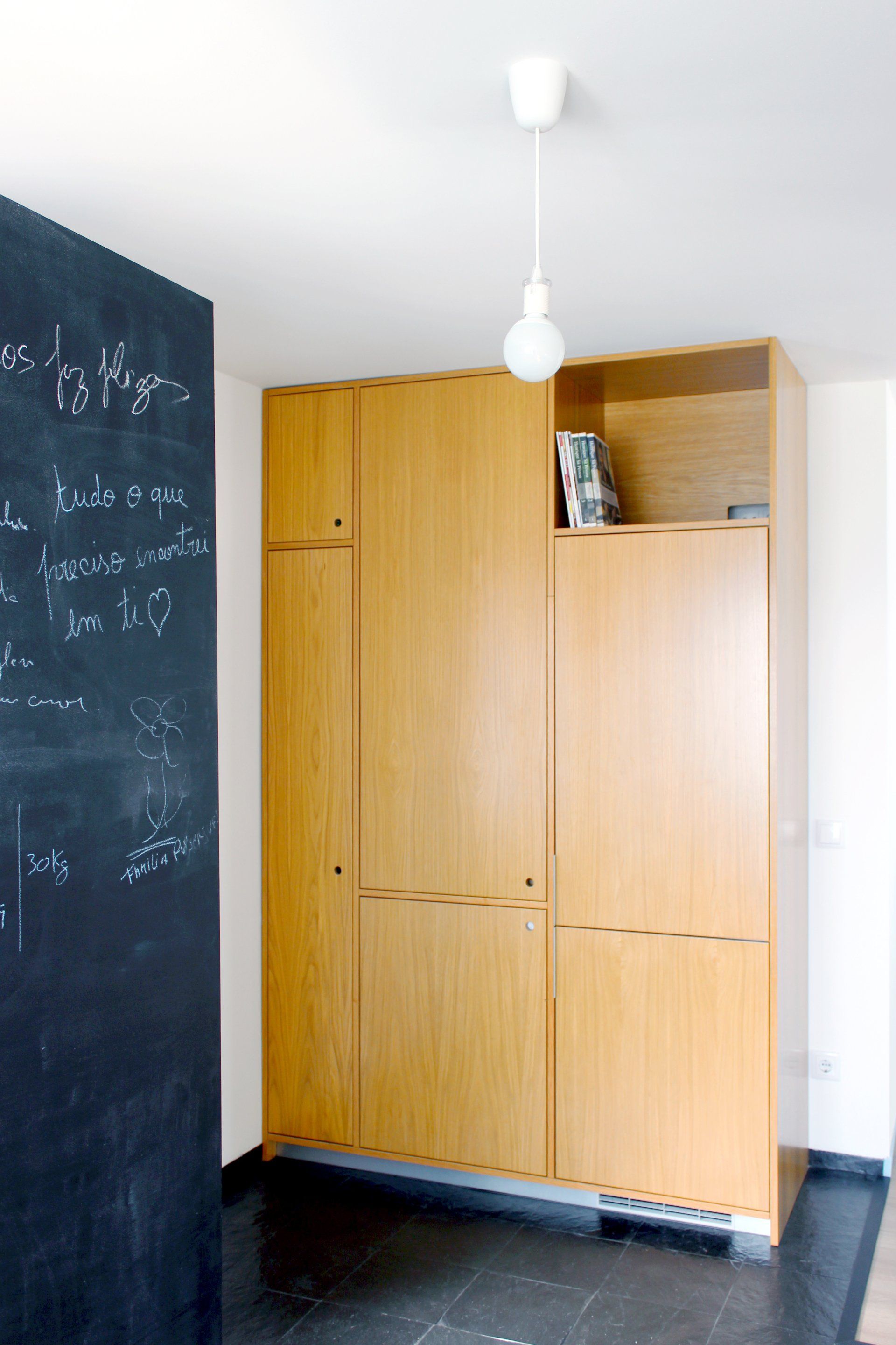 O carvalho, a ardosia e as particularidades do espaço foram os ingredientes desta cozinha. Da combinação destes ingredientes procurou-se com simplicidade o ponto certo de cozedura, e sem grandes temperos criaram-se uns móveis em carvalho com um balcão em ardosia e umas tampas para as pias, aumentando assim o espaço de balcão.