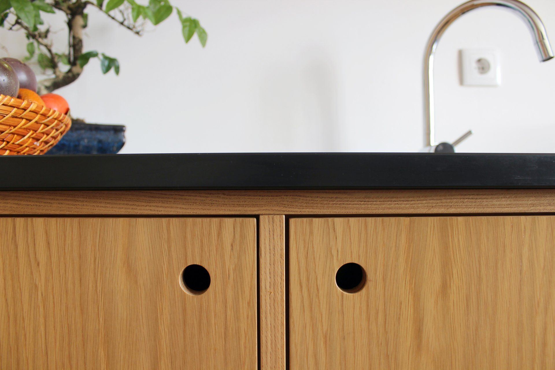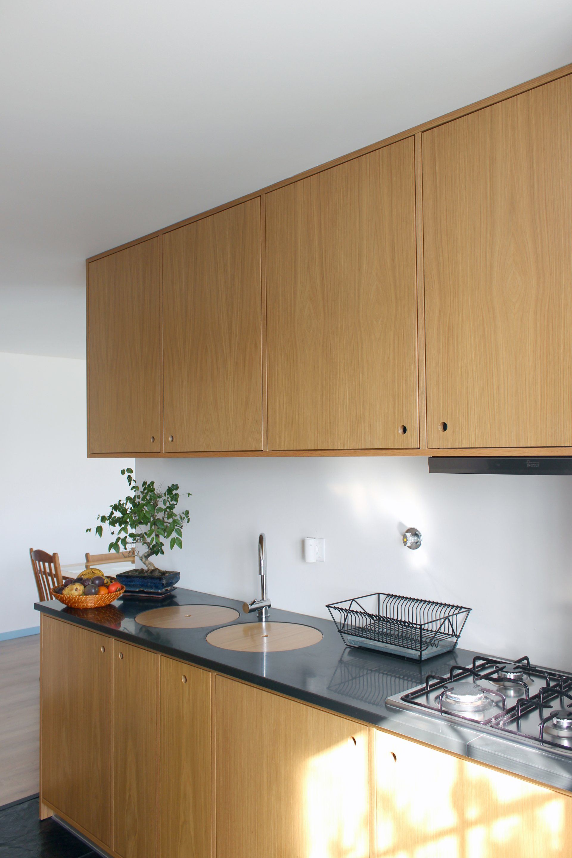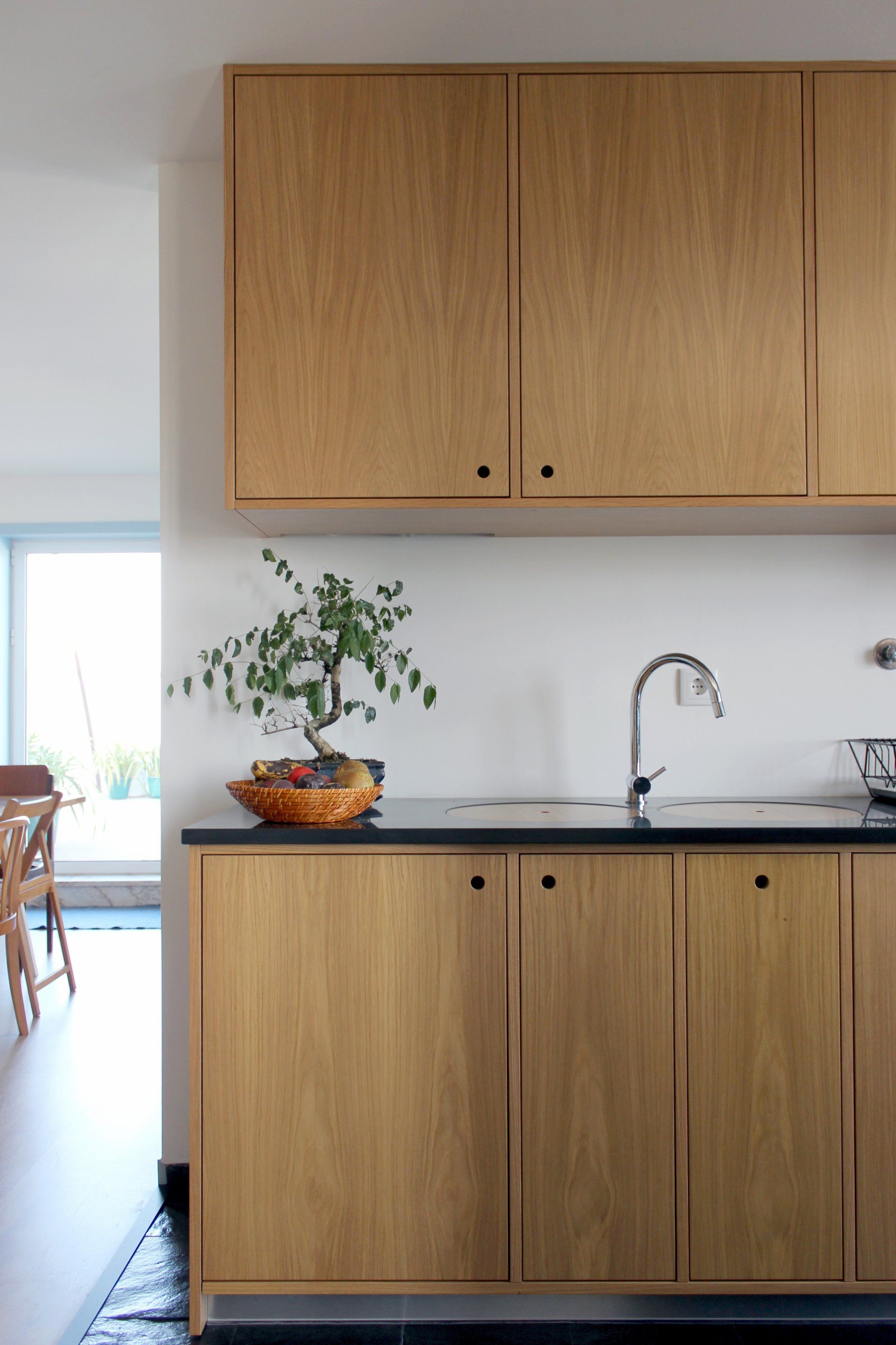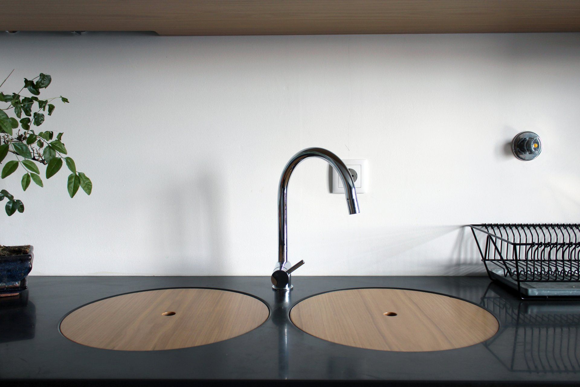 O carvalho, a ardosia e as particularidades do espaço foram os ingredientes desta cozinha. Da combinação destes ingredientes procurou-se com simplicidade o ponto certo de cozedura, e sem grandes temperos criaram-se uns móveis em carvalho com um balcão em ardosia e umas tampas para as pias, aumentando assim o espaço de balcão.