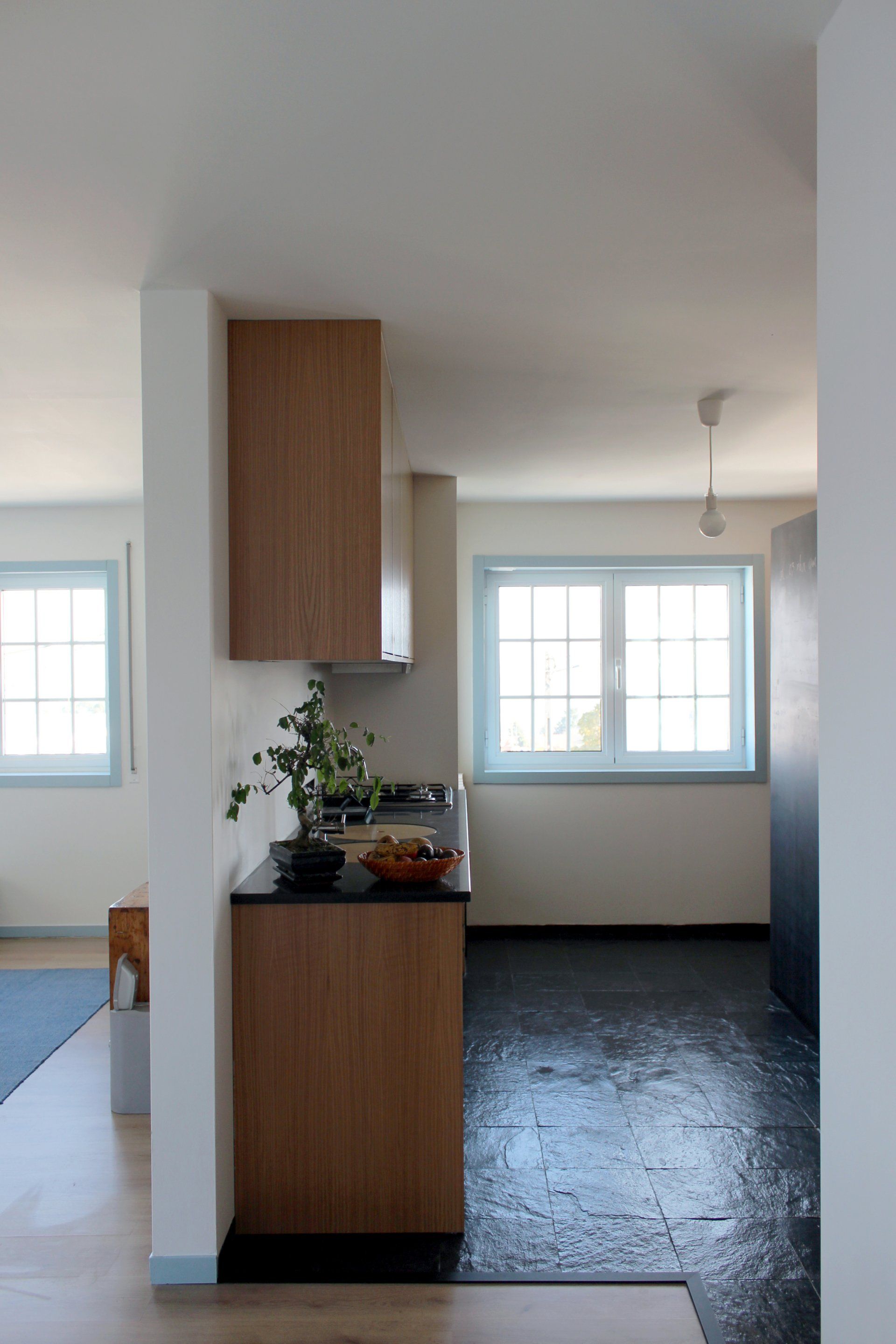 os pavimentos foram renovados. cozinha e casa de banho são revestidos em ardósia, e os restantes espaços com soalho. os tetos foram regularizados. as carpintarias são reaproveitadas e pintadas, uniformizando os diferentes tipos de madeiras, ao mesmo tempo que cria um cenário de transição entre os espaços