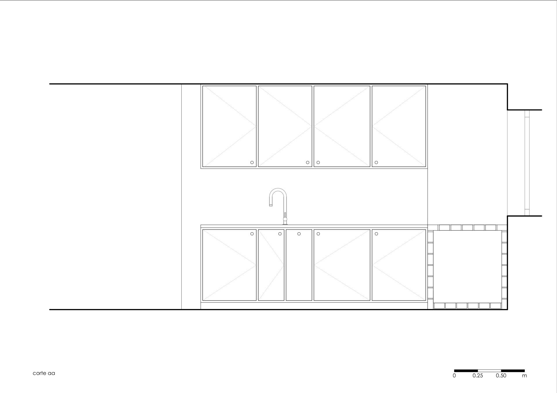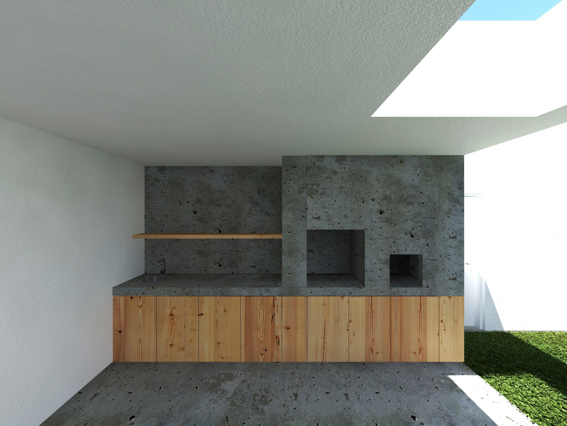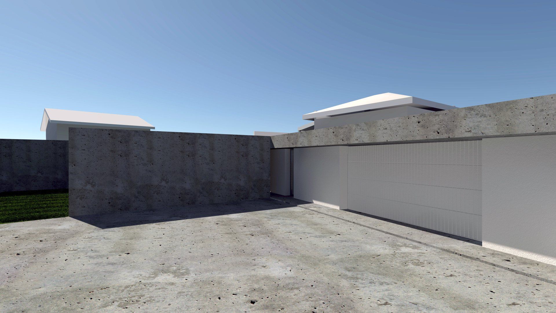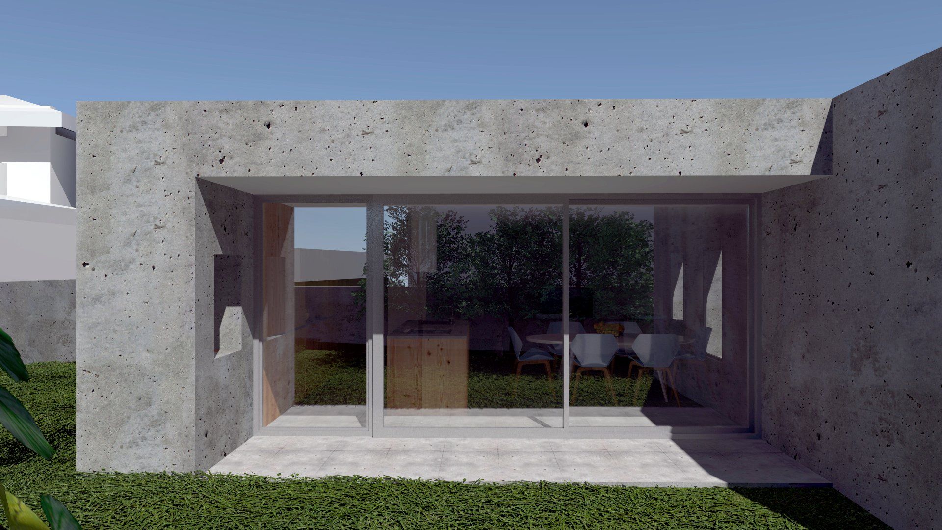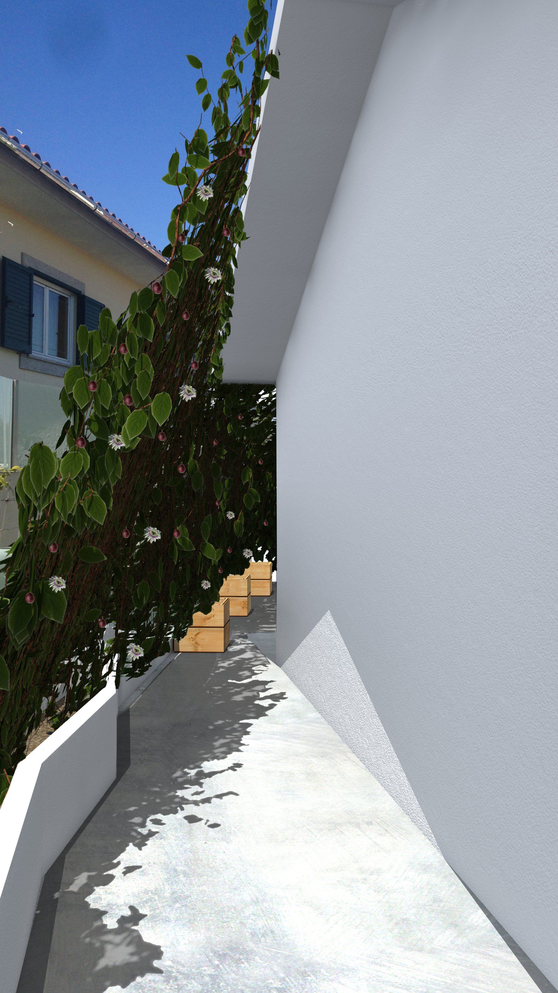 No exterior é ajustado o terreno á cota do piso para acabar com os desníveis na vivencia da casa, e aumentando o distanciamento visuais com a rua. No fundo do jardim são demolidas as construções existente, e ciado um espaço onde poderá ser instalado um arruma, uma churrasqueira e um alpendre de apoio ao jardim.