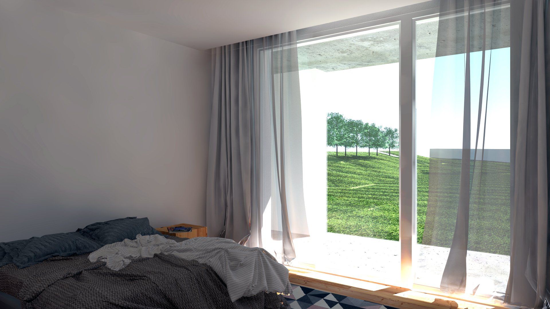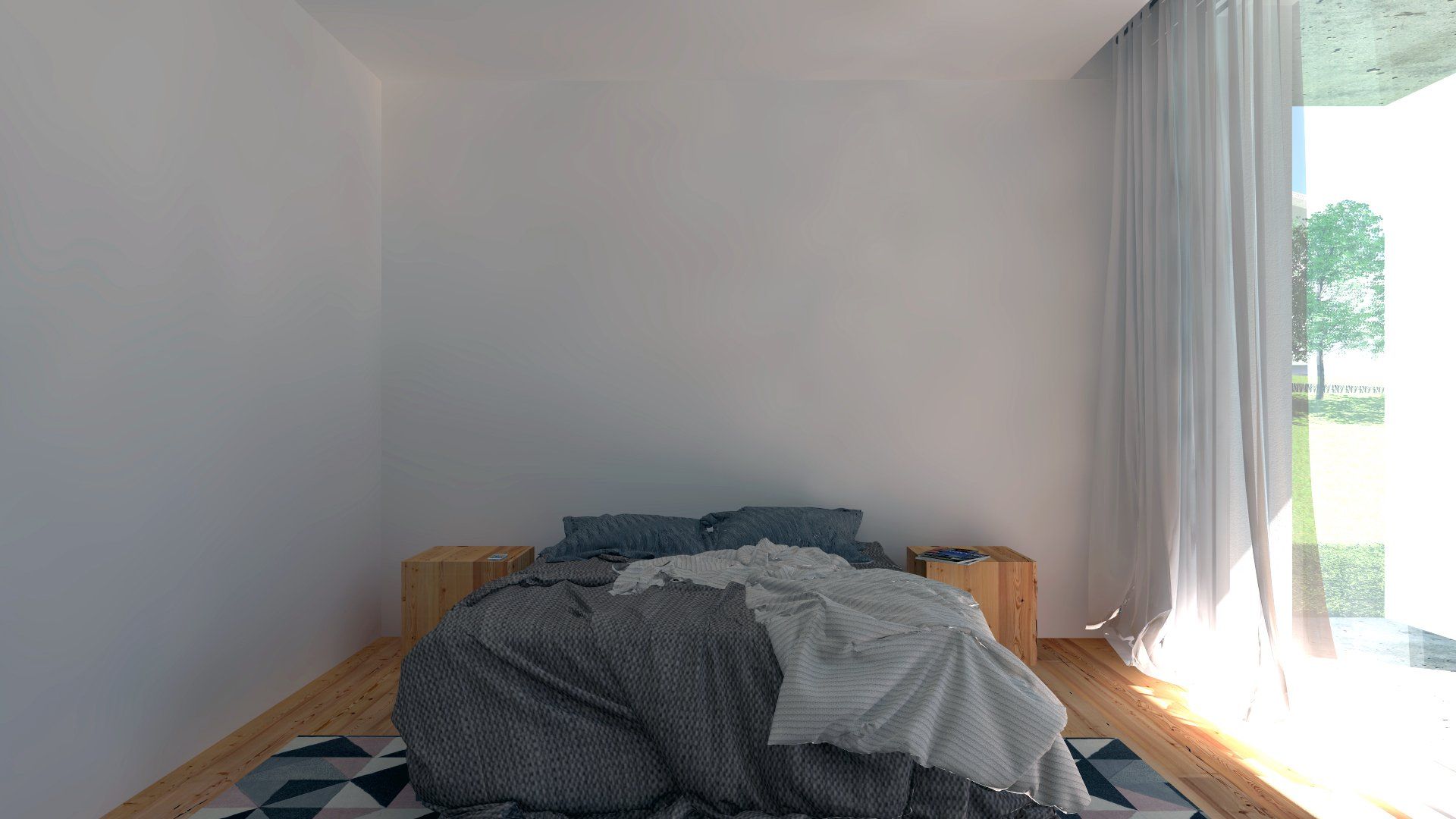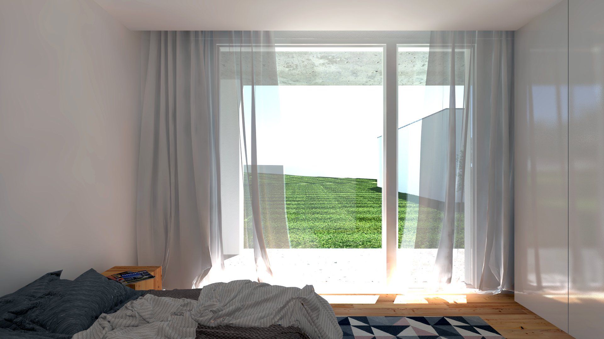 O piso 1, privado, é um volume mais “fechado” aos olhares exteriores. Os alçados Oeste, Este e Sul são marcados por a abertura de um pátio para o qual os quartos de abrem fazendo o controlo solar e visual. De base maior, faz o necessário sombreamento ao piso inferior.