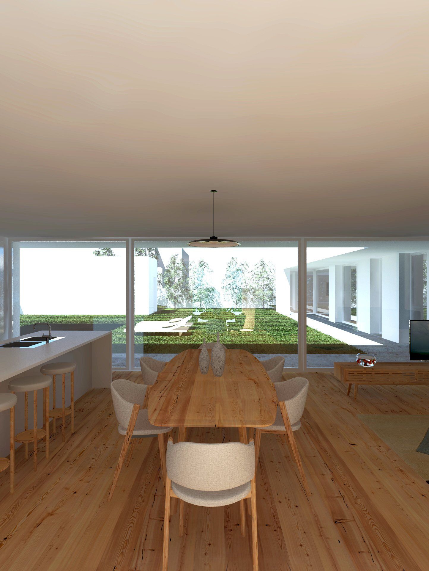 O piso do rés-do-chão é o piso social, e embora de menor área é o mais amplo, “aberto” para o jardim e piscina por vãos de grandes dimensões.