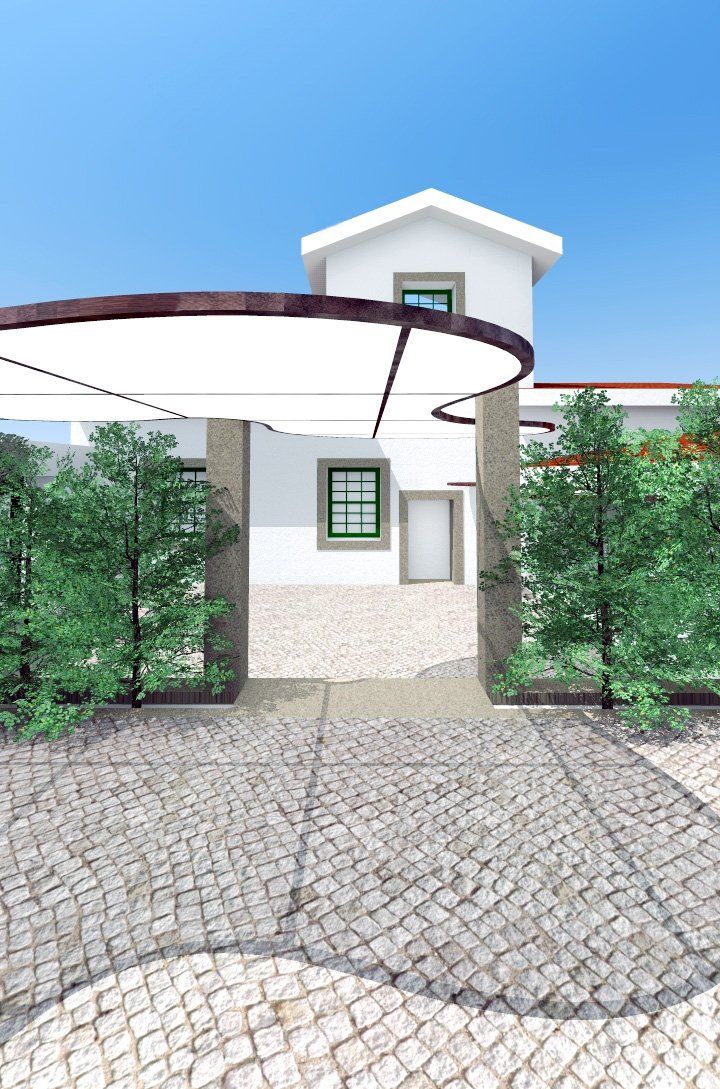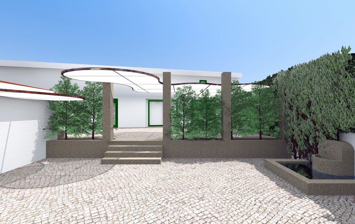 A proposta contempla a criação de uma zona coberta, num espaço exterior, organizado em dois pátios separados pela vegetação e pelo desnível de cotas, e delimitado por um muro, pela Casa Grande e pela Casa de Hóspedes. A simbiose entre a vegetação e as construções de época criam um ambiente bucólico.