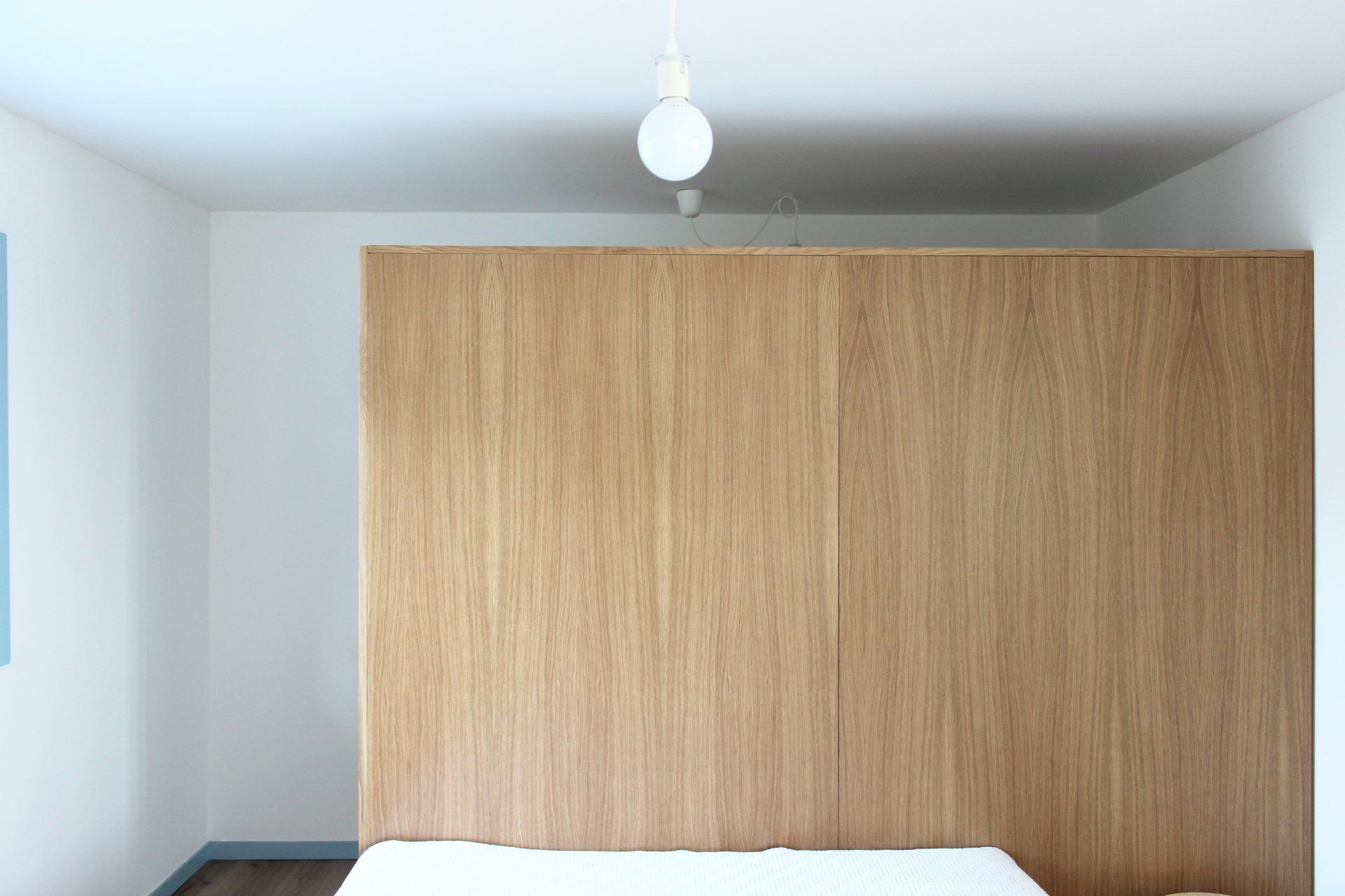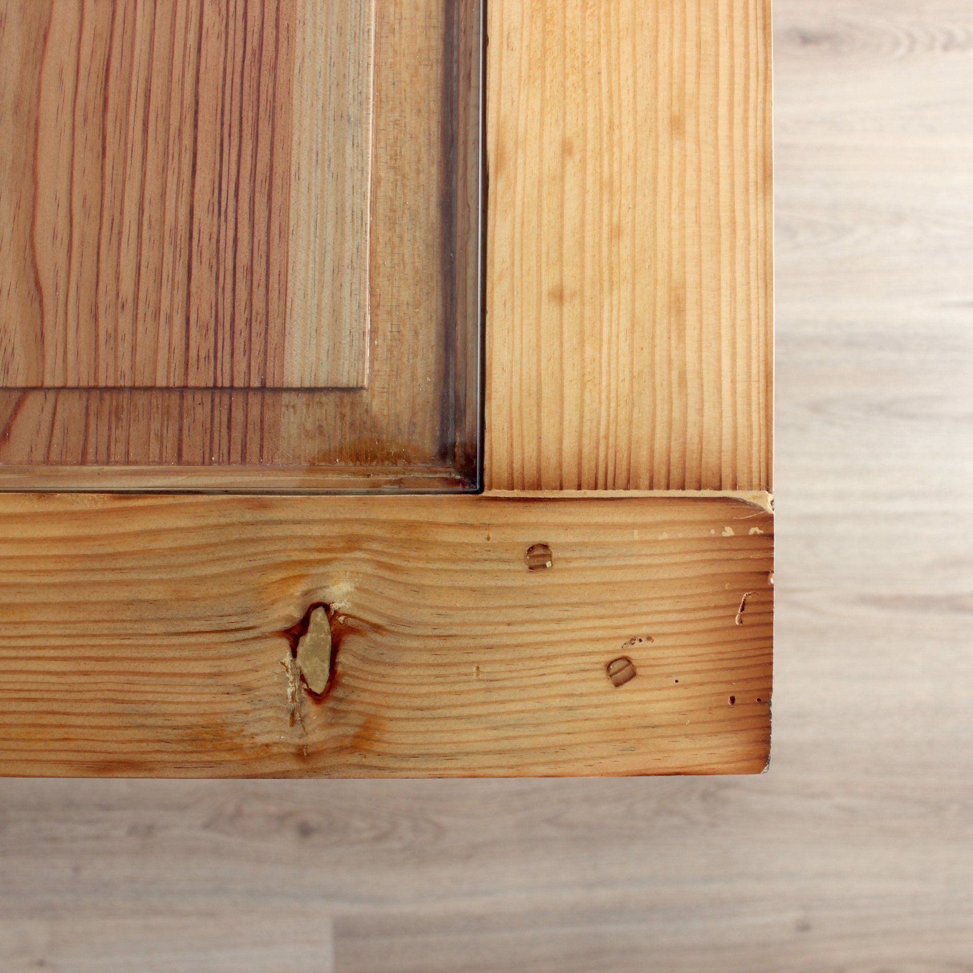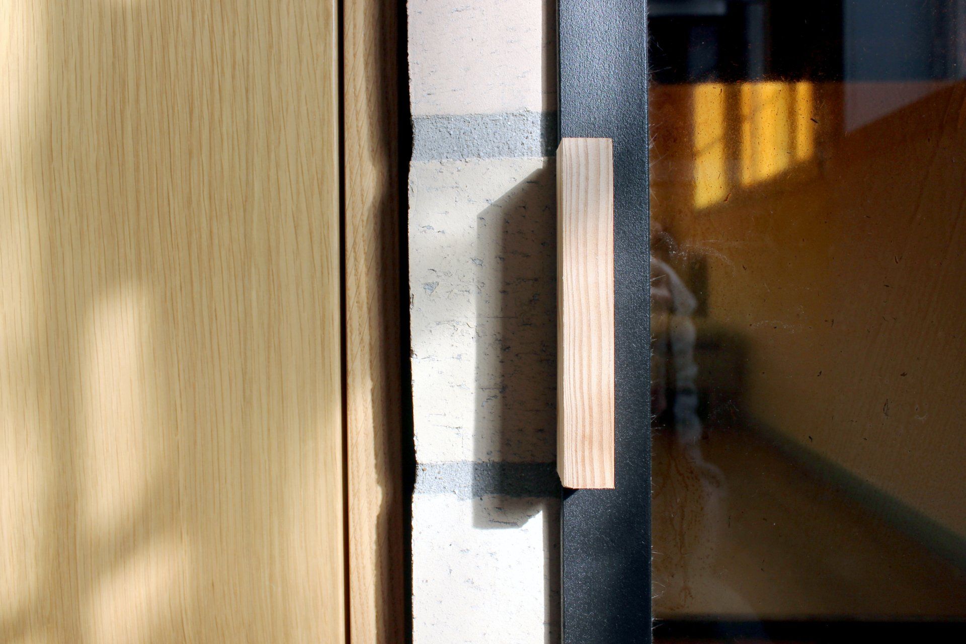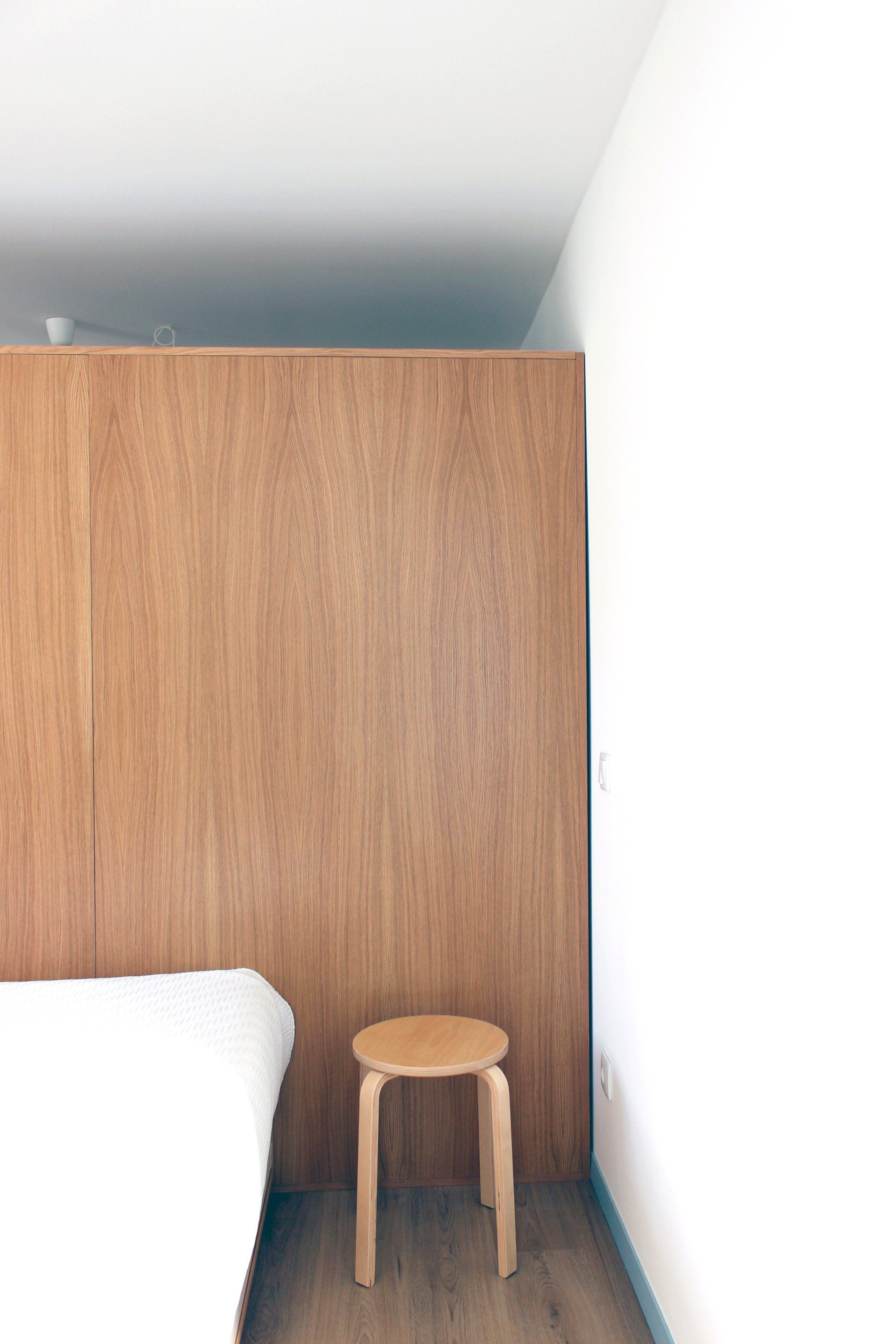 Da porta, conservou-se o seu desenho e recuperou-se a beleza natural da madeira. As imperfeições, o entalhe da fechadura e das dobradiças assumem-se como rugas do tempo, da sua história.