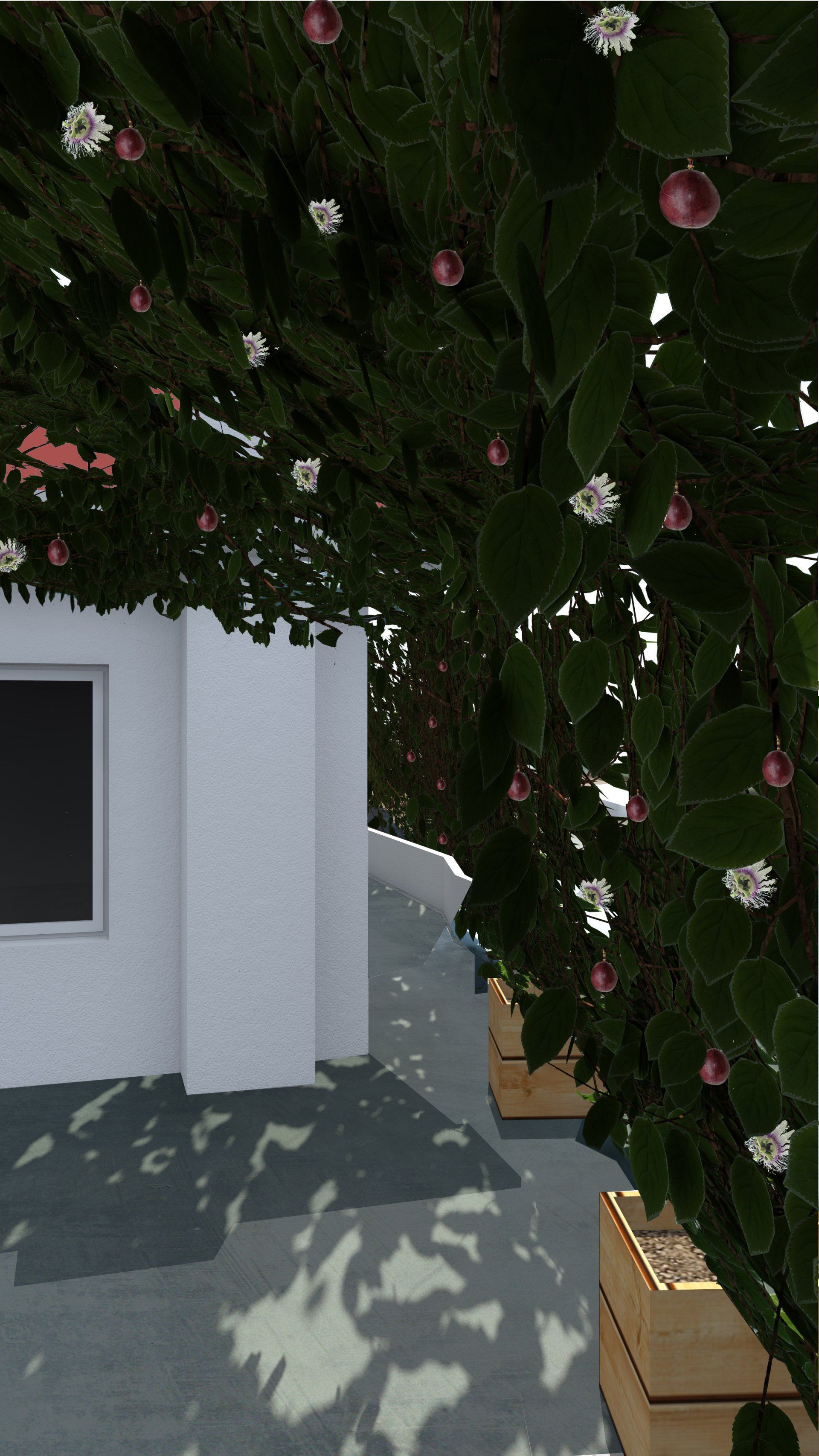 o uso de vegetação como material de construção dá ao terraço um uma atmosfera singular, de harmonia e conforto natural, onde é possível jantar, conversar ou simplesmente relaxar sobe o verde do maracujazeiro - a árvore escolhida para dar forma a esta ramada - e o roxo do seu fruto, o maracujá.