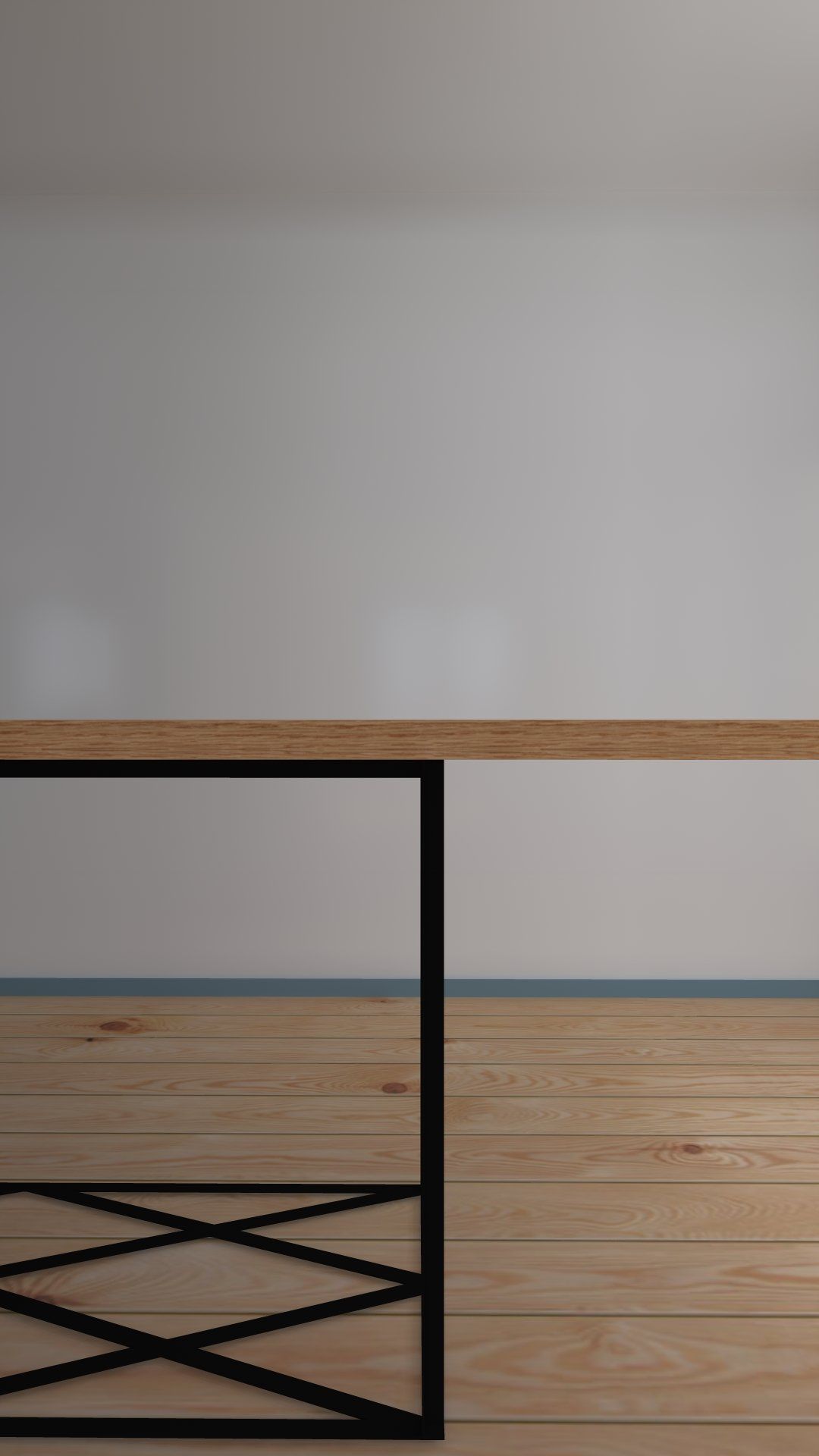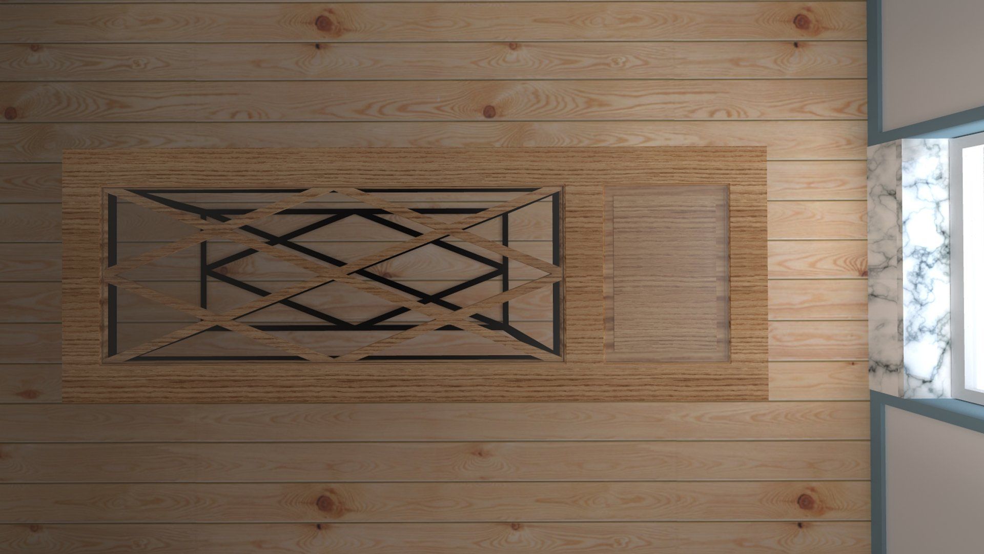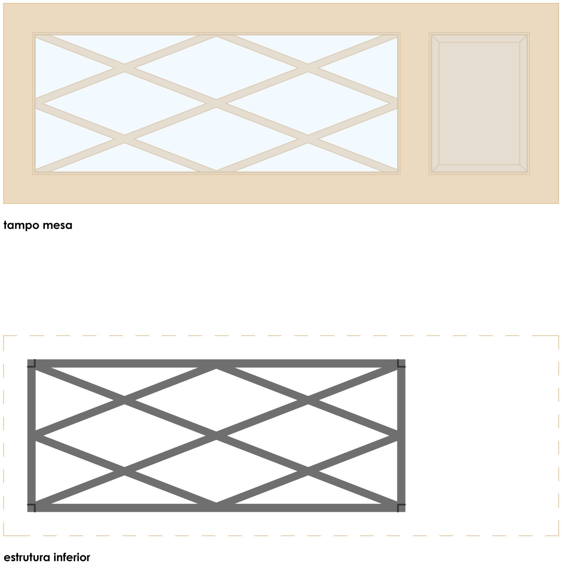 Contrastando com a delicadeza da madeira e assumindo o caracter industrial do ferro pintado, foi criada uma estrutura de suporte que se relaciona com a porta ao refletir o seu desenho.