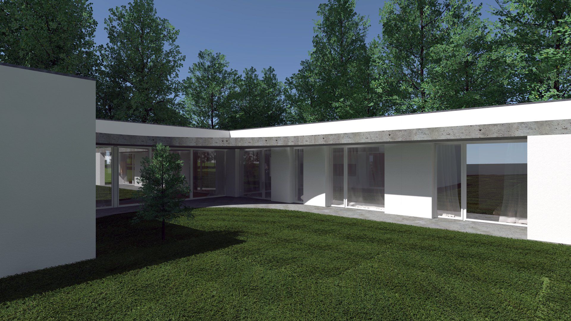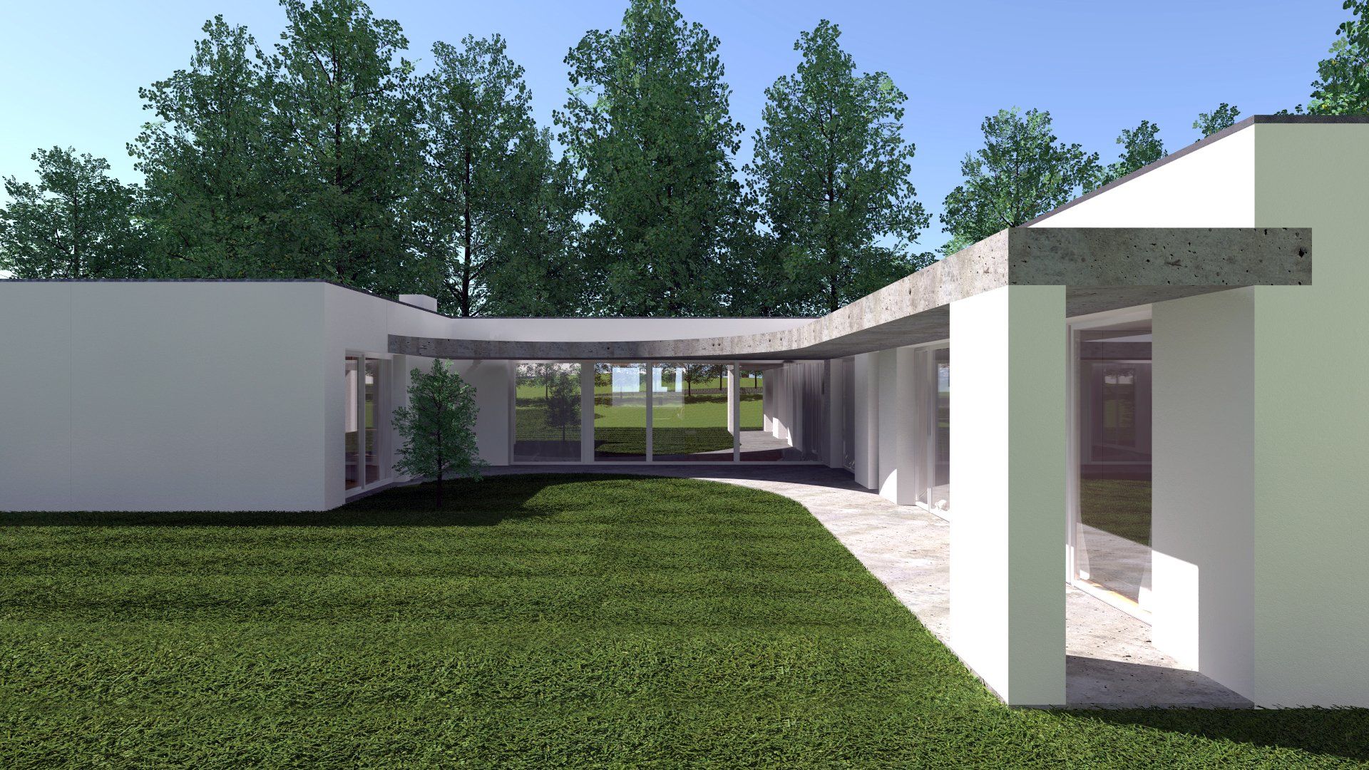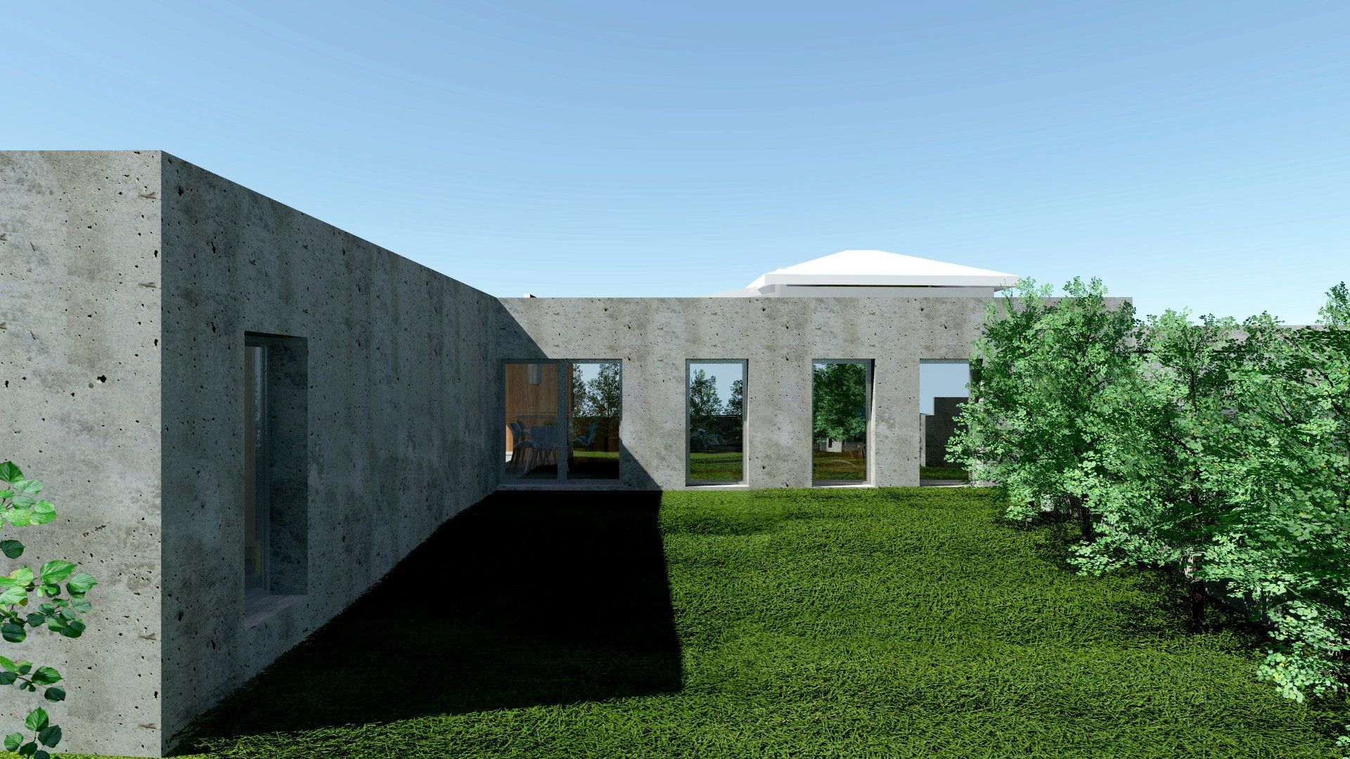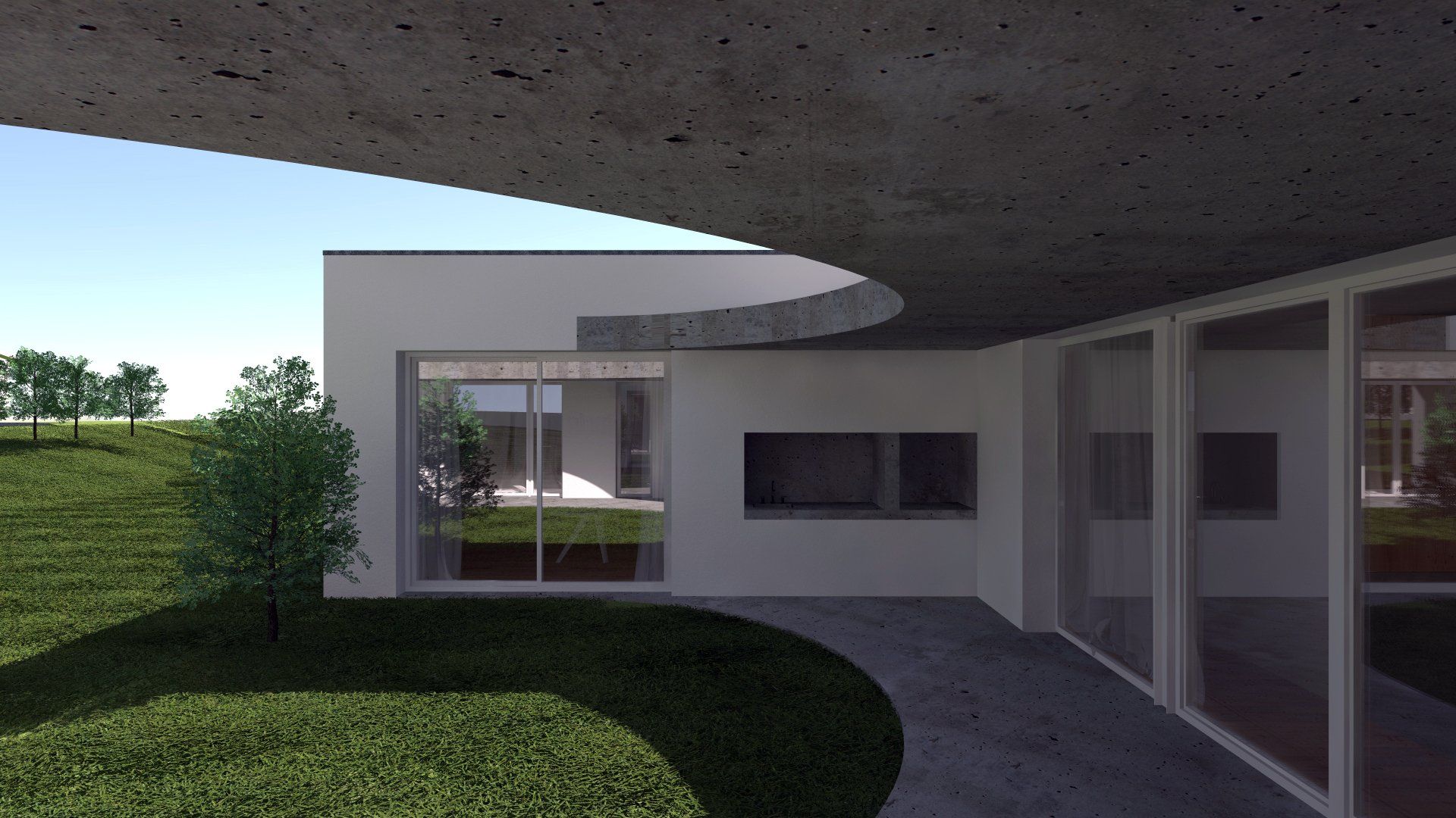 A casa - formada pela união de volumes - abraça uma pequena porção de terreno, criando um espaço exterior protegido e simultaneamente aberto, em torno do qual se dispõem e organizam os espaços principais. Um pala, de desenho curvo procura responder às diferentes necessidades de sombreamento.