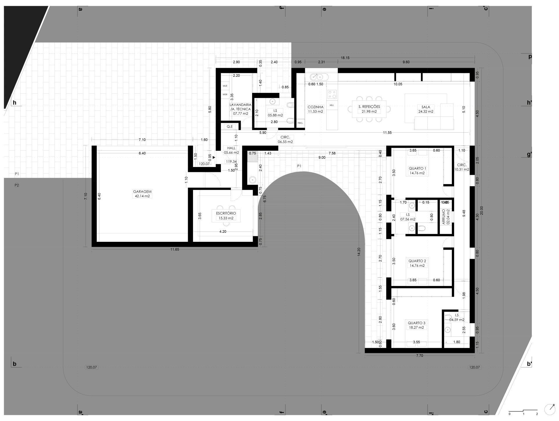 O piso -1, enterrado tem a função de garagem e arrumo.