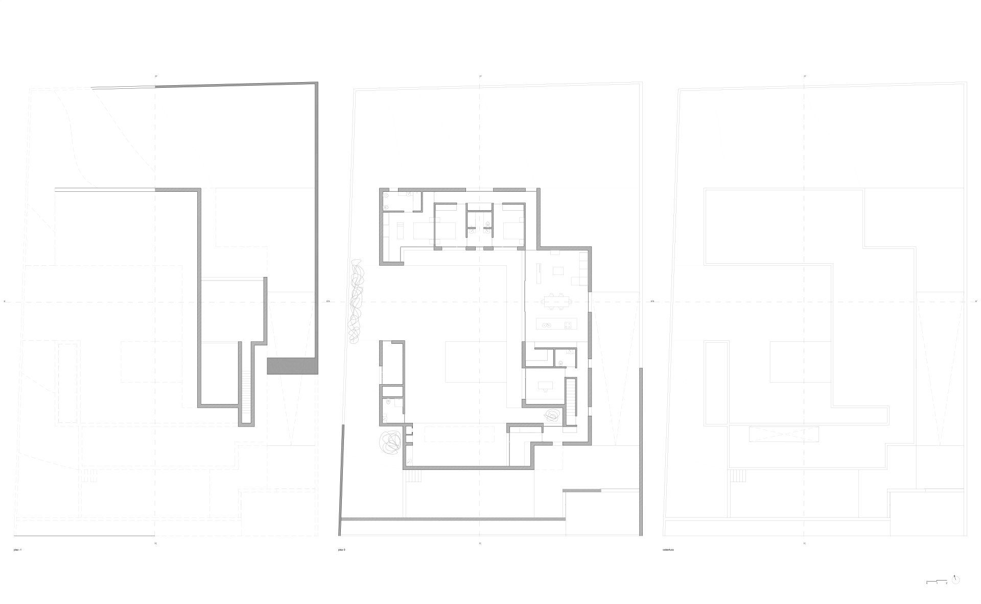 O primeiro volume é a manutenção parcial e prolongamento da construção existente, rematando o perfil irregular do limite do terreno na confrontação com o vizinho, e ao mesmo tempo mantendo o alinhamento preexistente com a rua. O segundo, mais afastado da rua e com a forma de “L” imposta pela forma singular do terreno, privilegiando a privacidade e a orientação solar.